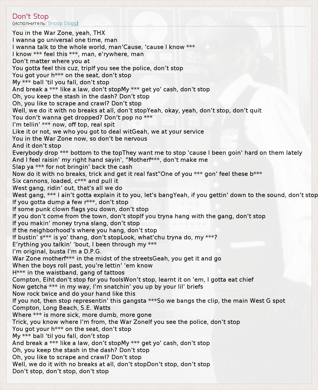 And break a *** like a law, don't stopMy *** get yo' cash, don't stop
