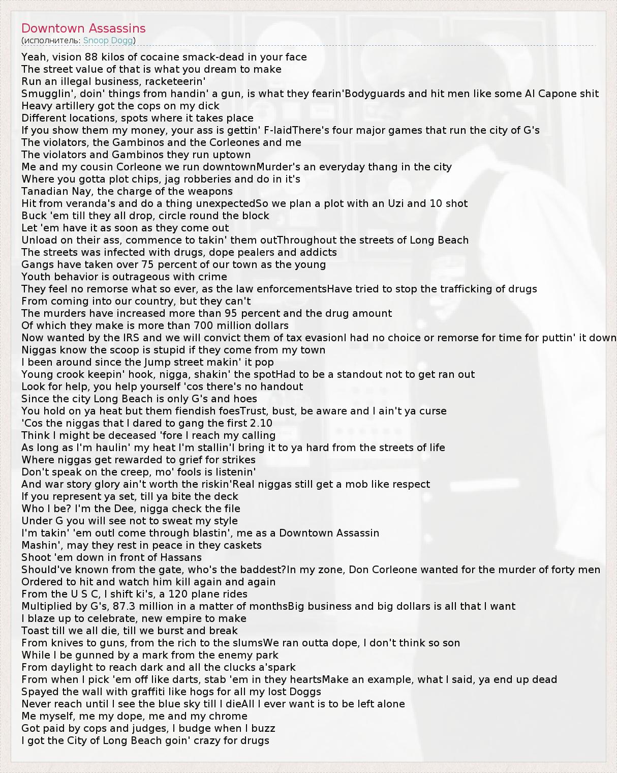 Yeah, vision 88 kilos of cocaine smack-dead in your face The street value of that is what you dream to make Run an illegal business, racketeerin' Smugglin', doin' things from handin' a gun, is what they fearin'Bodyguards and hit men like some Al Capone shit Heavy artillery got the cops on my dick Different locations, spots where it takes place If you show them my money, your ass is gettin' F-laidThere's four major games that run the city of G's The violators, the Gambinos and the Corleones and me The violators and Gambinos they run uptown Me and my cousin Corleone we run downtownMurder's an everyday thang in the city Where you gotta plot chips, jag robberies and do in it's Tanadian Nay, the charge of the weapons Hit from veranda's and do a thing unexpectedSo we plan a plot with an Uzi and 10 shot Buck 'em till they all drop, circle round the block Let 'em have it as soon as they come out Unload on their ass, commence to takin' them outThroughout the streets of Long Beach The streets was infected with drugs, dope pealers and addicts Gangs have taken over 75 percent of our town as the young Youth behavior is outrageous with crime They feel no remorse what so ever, as the law enforcementsHave tried to stop the trafficking of drugs From coming into our country, but they can't The murders have increased more than 95 percent and the drug amount Of which they make is more than 700 million dollars Now wanted by the IRS and we will convict them of tax evasionI had no choice or remorse for time for puttin' it down Niggas know the scoop is stupid if they come from my town I been around since the Jump street makin' it pop Young crook keepin' hook, nigga, shakin' the spotHad to be a standout not to get ran out Look for help, you help yourself 'cos there's no handout Since the city Long Beach is only G's and hoes You hold on ya heat but them fiendish foesTrust, bust, be aware and I ain't ya curse 'Cos the niggas that I dared to gang the first 2.10 Think I might be deceased 'fore I reach my calling As long as I'm haulin' my heat I'm stallin'I bring it to ya hard from the streets of life Where niggas get rewarded to grief for strikes Don't speak on the creep, mo' fools is listenin' And war story glory ain't worth the riskin'Real niggas still get a mob like respect If you represent ya set, till ya bite the deck Who I be? I'm the Dee, nigga check the file Under G you will see not to sweat my style I'm takin' 'em outI come through blastin', me as a Downtown Assassin Mashin', may they rest in peace in they caskets Shoot 'em down in front of Hassans Should've known from the gate, who's the baddest?In my zone, Don Corleone wanted for the murder of forty men Ordered to hit and watch him kill again and again From the U S C, I shift ki's, a 120 plane rides Multiplied by G's, 87.3 million in a matter of monthsBig business and big dollars is all that I want I blaze up to celebrate, new empire to make Toast till we all die, till we burst and break From knives to guns, from the rich to the slumsWe ran outta dope, I don't think so son While I be gunned by a mark from the enemy park From daylight to reach dark and all the clucks a'spark From when I pick 'em off like darts, stab 'em in they heartsMake an example, what I said, ya end up dead Spayed the wall with graffiti like hogs for all my lost Doggs Never reach until I see the blue sky till I dieAll I ever want is to be left alone Me myself, me my dope, me and my chrome Got paid by cops and judges, I budge when I buzz I got the City of Long Beach goin' crazy for drugs