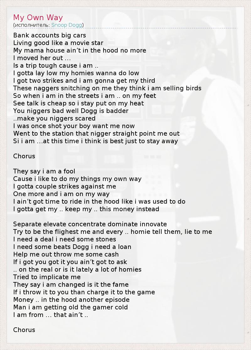 Банковские счета большие автомобили Живут хорошо как кинозвезда Не Моя мама дом не в капюшоне не более Я переехал ее из ... Является поездка жестким причиной я .. Я должен залечь мои корешей хочу сделать низкий Я получил два удара , и я собираюсь получить мой третий Эти naggers доносительства на меня они думают я продает птиц Так что, когда я на улицах я .. на ногах Смотреть разговоры дешево, поэтому я остаюсь надел тепла Вы ниггеры плохо хорошо Dogg является Баддер ..make вы негры страшно Я был один раз выстрелил вашего мальчика хочешь сейчас Пошел на станцию, негр прямо указывают меня Si я ... в это время я думаю, что лучше всего держаться подальше Припев Они говорят, что я дурак Потому что я люблю делать свои вещи мой собственный путь Я должен пару ударов против меня Еще одна , и я на моем пути У меня нет времени, чтобы ездить в капюшоне , как я привык делать Я должен получить мой .. держу .. эти деньги вместо Отдельный Elevate концентрат доминировать Инновации Постарайтесь бытьflighest меня и каждый .. братан сказать им , ложь для меня Мне нужен сделку мне нужно несколько камней Мне нужно несколько битов Dogg Мне нужен кредит Помоги мне бросить мне немного денег Если я получил вы получили его , вы не должны спросить .. На реальный или это в последнее время много корешей Пробовал вовлечь меня Они говорят, что я изменил это слава Если я бросить его для вас, чем взимать его с игры Деньги .. в капюшоне еще один эпизод Человек я старею геймер холодно Я из ... , что не .. Припев