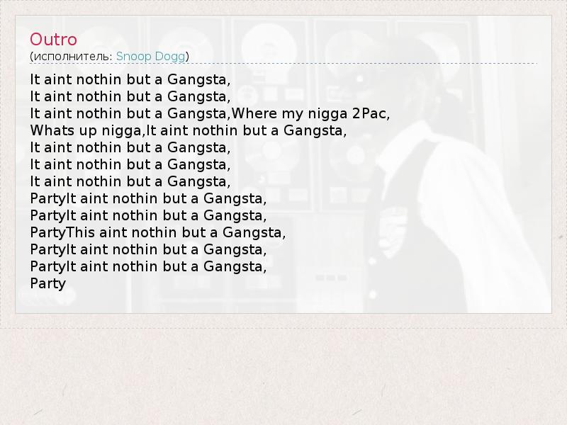 It aint nothin but a Gangsta, It aint nothin but a Gangsta, It aint nothin but a Gangsta,Where my nigga 2Pac, Whats up nigga,It aint nothin but a Gangsta, It aint nothin but a Gangsta, It aint nothin but a Gangsta, It aint nothin but a Gangsta, PartyIt aint nothin but a Gangsta, PartyIt aint nothin but a Gangsta, PartyThis aint nothin but a Gangsta, PartyIt aint nothin but a Gangsta, PartyIt aint nothin but a Gangsta, Party