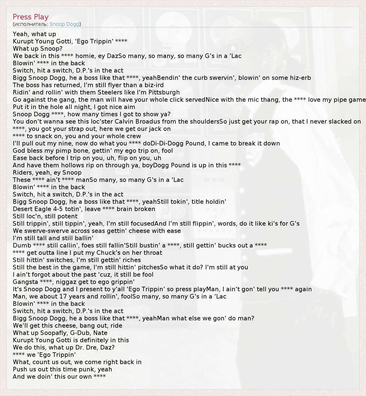 Yeah, what up Kurupt Young Gotti, 'Ego Trippin' **** What up Snoop? We back in this **** homie, ey DazSo many, so many, so many G's in a 'Lac Blowin' **** in the back Switch, hit a switch, D.P.'s in the act Bigg Snoop Dogg, he a boss like that ****, yeahBendin' the curb swervin', blowin' on some hiz-erb The boss has returned, I'm still flyer than a biz-ird Ridin' and rollin' with them Steelers like I'm Pittsburgh Go against the gang, the man will have your whole click servedNice with the mic thang, the **** love my pipe game Put it in the hole all night, I got nice aim Snoop Dogg ****, how many times I got to show ya? You don't wanna see this loc'ster Calvin Broadus from the shouldersSo just get your rap on, that I never slacked on ****, you got your strap out, here we get our jack on **** to snack on, you and your whole crew I'll pull out my nine, now do what you **** doDi-Di-Dogg Pound, I came to break it down God bless my pimp bone, gettin' my ego trip on, fool Ease back before I trip on you, uh, flip on you, uh And have them hollows rip on through ya, boyDogg Pound is up in this **** Riders, yeah, ey Snoop These **** ain't **** manSo many, so many G's in a 'Lac Blowin' **** in the back Switch, hit a switch, D.P.'s in the act Bigg Snoop Dogg, he a boss like that ****, yeahStill tokin', title holdin' Desert Eagle 4-5 totin', leave **** brain broken Still loc'n, still potent Still trippin', still tippin', yeah, I'm still focusedAnd I'm still flippin', words, do it like ki's for G's We swerve-swerve across seas gettin' cheese with ease I'm still tall and still ballin' Dumb **** still callin', foes still fallin'Still bustin' a ****, still gettin' bucks out a **** **** get outta line I put my Chuck's on her throat Still hittin' switches, I'm still gettin' riches Still the best in the game, I'm still hittin' pitchesSo what it do? I'm still at you I ain't forgot about the past 'cuz, it still be fool Gangsta ****, niggaz get to ego grippin' It's Snoop Dogg and I present to y'all 'Ego Trippin' so press playMan, I ain't gon' tell you **** again Man, we about 17 years and rollin', foolSo many, so many G's in a 'Lac Blowin' **** in the back Switch, hit a switch, D.P.'s in the act Bigg Snoop Dogg, he a boss like that ****, yeahMan what else we gon' do man? We'll get this cheese, bang out, ride What up Soopafly, G-Dub, Nate Kurupt Young Gotti is definitely in this We do this, what up Dr. Dre, Daz? **** we 'Ego Trippin' What, count us out, we come right back in Push us out this time punk, yeah And we doin' this our own ****