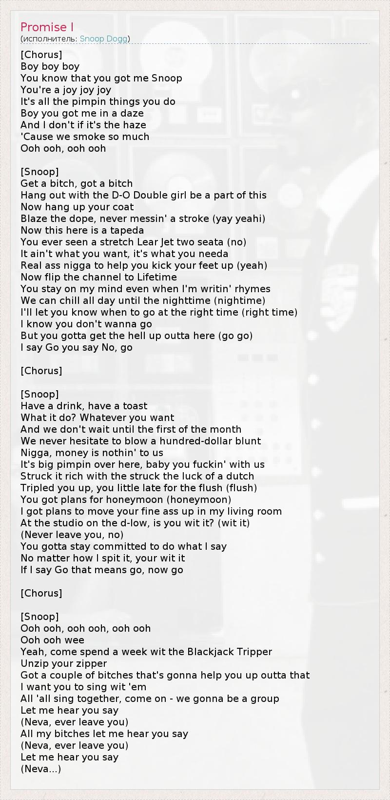 Это интересно:Snoop Dogg (наст. имя Calvin Broadus, родился 20 октября 1971 г.) — американский рэппер, продюсер и актер. Больше всего Снуп известен как МС на хип-хоп сцене западного побережья и один из самых талантливых протеже Dr. Dre.Мать Снупа называла его «Snoopy» (с английского — «чрезмерно любопытный») за выражение его глаз. Когда он начал записываться, то взял себе псевдоним Snoop Doggy Dogg, в честь известного персонажа... продолжение