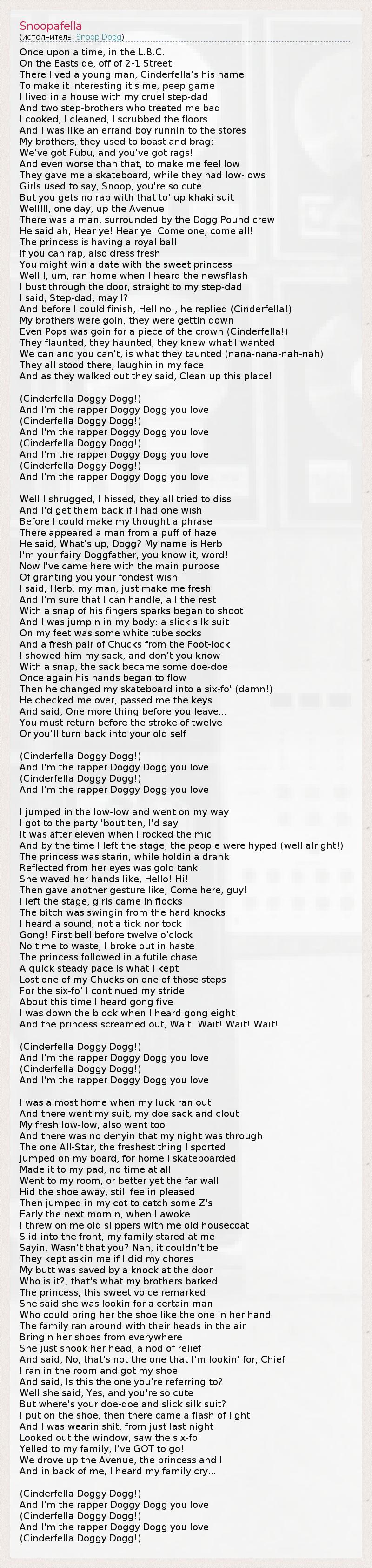 Once upon a time, in the L.B.C. On the Eastside, off of 2-1 Street There lived a young man, Cinderfella's his name To make it interesting it's me, peep game I lived in a house with my cruel step-dad And two step-brothers who treated me bad I cooked, I cleaned, I scrubbed the floors And I was like an errand boy runnin to the stores My brothers, they used to boast and brag: We've got Fubu, and you've got rags! And even worse than that, to make me feel low They gave me a skateboard, while they had low-lows Girls used to say, Snoop, you're so cute But you gets no rap with that to' up khaki suit Welllll, one day, up the Avenue There was a man, surrounded by the Dogg Pound crew He said ah, Hear ye! Hear ye! Come one, come all! The princess is having a royal ball If you can rap, also dress fresh You might win a date with the sweet princess Well I, um, ran home when I heard the newsflash I bust through the door, straight to my step-dad I said, Step-dad, may I? And before I could finish, Hell no!, he replied (Cinderfella!) My brothers were goin, they were gettin down Even Pops was goin for a piece of the crown (Cinderfella!) They flaunted, they haunted, they knew what I wanted We can and you can't, is what they taunted (nana-nana-nah-nah) They all stood there, laughin in my face And as they walked out they said, Clean up this place! (Cinderfella Doggy Dogg!) And I'm the rapper Doggy Dogg you love (Cinderfella Doggy Dogg!) And I'm the rapper Doggy Dogg you love (Cinderfella Doggy Dogg!) And I'm the rapper Doggy Dogg you love (Cinderfella Doggy Dogg!) And I'm the rapper Doggy Dogg you love Well I shrugged, I hissed, they all tried to diss And I'd get them back if I had one wish Before I could make my thought a phrase There appeared a man from a puff of haze He said, What's up, Dogg? My name is Herb I'm your fairy Doggfather, you know it, word! Now I've came here with the main purpose Of granting you your fondest wish I said, Herb, my man, just make me fresh And I'm sure that I can handle, all the rest With a snap of his fingers sparks began to shoot And I was jumpin in my body: a slick silk suit On my feet was some white tube socks And a fresh pair of Chucks from the Foot-lock I showed him my sack, and don't you know With a snap, the sack became some doe-doe Once again his hands began to flow Then he changed my skateboard into a six-fo' (damn!) He checked me over, passed me the keys And said, One more thing before you leave... You must return before the stroke of twelve Or you'll turn back into your old self (Cinderfella Doggy Dogg!) And I'm the rapper Doggy Dogg you love (Cinderfella Doggy Dogg!) And I'm the rapper Doggy Dogg you love I jumped in the low-low and went on my way I got to the party 'bout ten, I'd say It was after eleven when I rocked the mic And by the time I left the stage, the people were hyped (well alright!) The princess was starin, while holdin a drank Reflected from her eyes was gold tank She waved her hands like, Hello! Hi! Then gave another gesture like, Come here, guy! I left the stage, girls came in flocks The bitch was swingin from the hard knocks I heard a sound, not a tick nor tock Gong! First bell before twelve o'clock No time to waste, I broke out in haste The princess followed in a futile chase A quick steady pace is what I kept Lost one of my Chucks on one of those steps For the six-fo' I continued my stride About this time I heard gong five I was down the block when I heard gong eight And the princess screamed out, Wait! Wait! Wait! Wait! (Cinderfella Doggy Dogg!) And I'm the rapper Doggy Dogg you love (Cinderfella Doggy Dogg!) And I'm the rapper Doggy Dogg you love I was almost home when my luck ran out And there went my suit, my doe sack and clout My fresh low-low, also went too And there was no denyin that my night was through The one All-Star, the freshest thing I sported Jumped on my board, for home I skateboarded Made it to my pad, no time at all Went to my room, or better yet the far wall Hid the shoe away, still feelin pleased Then jumped in my cot to catch some Z's Early the next mornin, when I awoke I threw on me old slippers with me old housecoat Slid into the front, my family stared at me Sayin, Wasn't that you? Nah, it couldn't be They kept askin me if I did my chores My butt was saved by a knock at the door Who is it?, that's what my brothers barked The princess, this sweet voice remarked She said she was lookin for a certain man Who could bring her the shoe like the one in her hand The family ran around with their heads in the air Bringin her shoes from everywhere She just shook her head, a nod of relief And said, No, that's not the one that I'm lookin' for, Chief I ran in the room and got my shoe And said, Is this the one you're referring to? Well she said, Yes, and you're so cute But where's your doe-doe and slick silk suit? I put on the shoe, then there came a flash of light And I was wearin shit, from just last night Looked out the window, saw the six-fo' Yelled to my family, I've GOT to go! We drove up the Avenue, the princess and I And in back of me, I heard my family cry... (Cinderfella Doggy Dogg!) And I'm the rapper Doggy Dogg you love (Cinderfella Doggy Dogg!) And I'm the rapper Doggy Dogg you love (Cinderfella Doggy Dogg!)