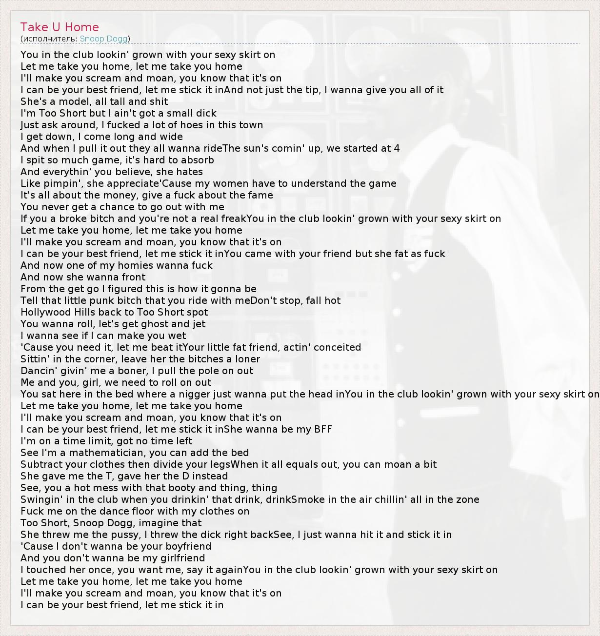 You in the club lookin' grown with your sexy skirt on Let me take you home, let me take you home I'll make you scream and moan, you know that it's on I can be your best friend, let me stick it inAnd not just the tip, I wanna give you all of it She's a model, all tall and shit I'm Too Short but I ain't got a small dick Just ask around, I fucked a lot of hoes in this town I get down, I come long and wide And when I pull it out they all wanna rideThe sun's comin' up, we started at 4 I spit so much game, it's hard to absorb And everythin' you believe, she hates Like pimpin', she appreciate'Cause my women have to understand the game It's all about the money, give a fuck about the fame You never get a chance to go out with me If you a broke bitch and you're not a real freakYou in the club lookin' grown with your sexy skirt on Let me take you home, let me take you home I'll make you scream and moan, you know that it's on I can be your best friend, let me stick it inYou came with your friend but she fat as fuck And now one of my homies wanna fuck And now she wanna front From the get go I figured this is how it gonna be Tell that little punk bitch that you ride with meDon't stop, fall hot Hollywood Hills back to Too Short spot You wanna roll, let's get ghost and jet I wanna see if I can make you wet 'Cause you need it, let me beat itYour little fat friend, actin' conceited Sittin' in the corner, leave her the bitches a loner Dancin' givin' me a boner, I pull the pole on out Me and you, girl, we need to roll on out You sat here in the bed where a nigger just wanna put the head inYou in the club lookin' grown with your sexy skirt on Let me take you home, let me take you home I'll make you scream and moan, you know that it's on I can be your best friend, let me stick it inShe wanna be my BFF I'm on a time limit, got no time left See I'm a mathematician, you can add the bed Subtract your clothes then divide your legsWhen it all equals out, you can moan a bit She gave me the T, gave her the D instead See, you a hot mess with that booty and thing, thing Swingin' in the club when you drinkin' that drink, drinkSmoke in the air chillin' all in the zone Fuck me on the dance floor with my clothes on Too Short, Snoop Dogg, imagine that She threw me the pussy, I threw the dick right backSee, I just wanna hit it and stick it in 'Cause I don't wanna be your boyfriend And you don't wanna be my girlfriend I touched her once, you want me, say it againYou in the club lookin' grown with your sexy skirt on Let me take you home, let me take you home I'll make you scream and moan, you know that it's on I can be your best friend, let me stick it in