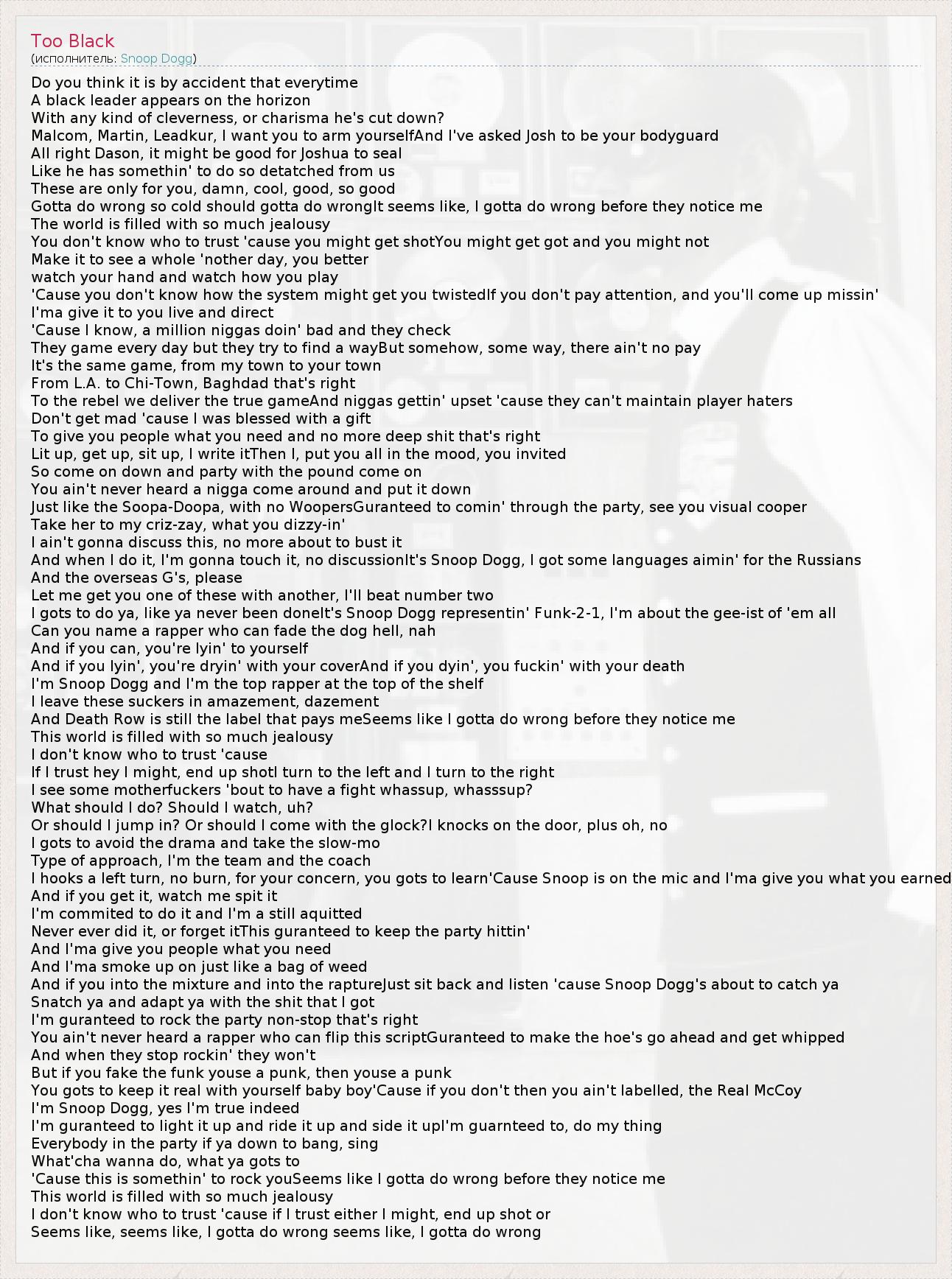 Это интересно:Snoop Dogg (наст. имя Calvin Broadus, родился 20 октября 1971 г.) — американский рэппер, продюсер и актер. Больше всего Снуп известен как МС на хип-хоп сцене западного побережья и один из самых талантливых протеже Dr. Dre.Мать Снупа называла его «Snoopy» (с английского — «чрезмерно любопытный») за выражение его глаз. Когда он начал записываться, то взял себе псевдоним Snoop Doggy Dogg, в честь известного персонажа... продолжение