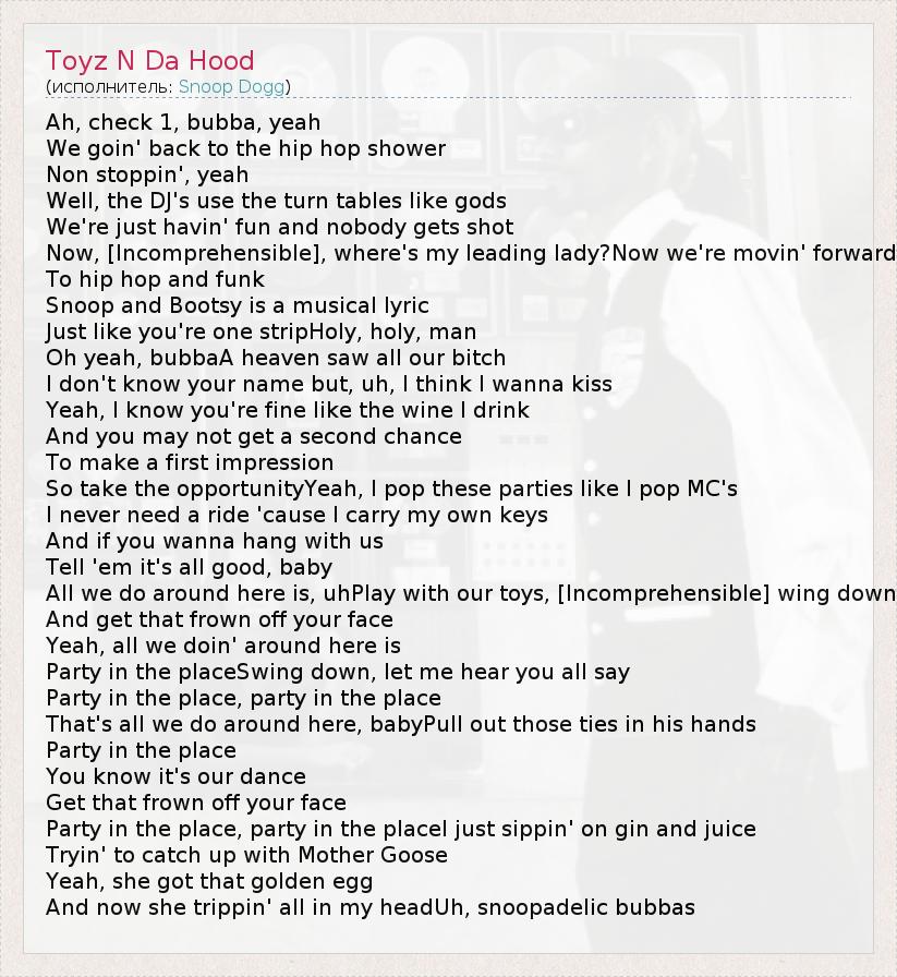 Ah, check 1, bubba, yeah We goin' back to the hip hop shower Non stoppin', yeah Well, the DJ's use the turn tables like gods We're just havin' fun and nobody gets shot Now, [Incomprehensible], where's my leading lady?Now we're movin' forward To hip hop and funk Snoop and Bootsy is a musical lyric Just like you're one stripHoly, holy, man Oh yeah, bubbaA heaven saw all our bitch I don't know your name but, uh, I think I wanna kiss Yeah, I know you're fine like the wine I drink And you may not get a second chance To make a first impression So take the opportunityYeah, I pop these parties like I pop MC's I never need a ride 'cause I carry my own keys And if you wanna hang with us Tell 'em it's all good, baby All we do around here is, uhPlay with our toys, [Incomprehensible] wing down And get that frown off your face Yeah, all we doin' around here is Party in the placeSwing down, let me hear you all say Party in the place, party in the place That's all we do around here, babyPull out those ties in his hands Party in the place You know it's our dance Get that frown off your face Party in the place, party in the placeI just sippin' on gin and juice Tryin' to catch up with Mother Goose Yeah, she got that golden egg And now she trippin' all in my headUh, snoopadelic bubbas