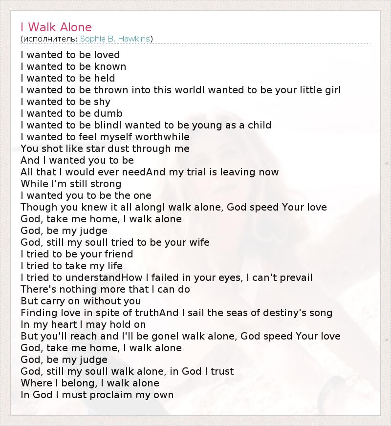 I wanted to be loved I wanted to be known I wanted to be held I wanted to be thrown into this worldI wanted to be your little girl I wanted to be shy I wanted to be dumb I wanted to be blindI wanted to be young as a child I wanted to feel myself worthwhile You shot like star dust through me And I wanted you to be All that I would ever needAnd my trial is leaving now While I'm still strong I wanted you to be the one Though you knew it all alongI walk alone, God speed Your love God, take me home, I walk alone God, be my judge God, still my soulI tried to be your wife I tried to be your friend I tried to take my life I tried to understandHow I failed in your eyes, I can't prevail There's nothing more that I can do But carry on without you Finding love in spite of truthAnd I sail the seas of destiny's song In my heart I may hold on But you'll reach and I'll be goneI walk alone, God speed Your love God, take me home, I walk alone God, be my judge God, still my soulI walk alone, in God I trust Where I belong, I walk alone In God I must proclaim my own