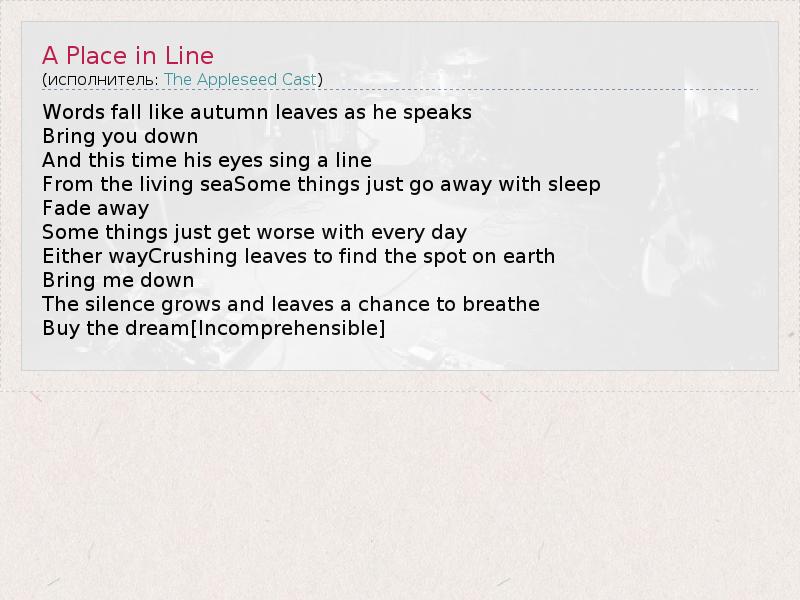 Это интересно:The Appleseed Cast - группа из города Лоуренс, штат Канзас, играющая смесь из indie / emo / post-rock / alternative rock.“Основание и дебют (1997 - 1998)”Инди группа The Appleseed Cast была образована в 1997 году в Южной Калифорнии музыкантами: Christopher Crisci, Jason Wickersheim и Louie Ruiz и изначально называлась December's Tragic Drive (название коллектива - фраза, взятая из песни “Seven"... продолжение