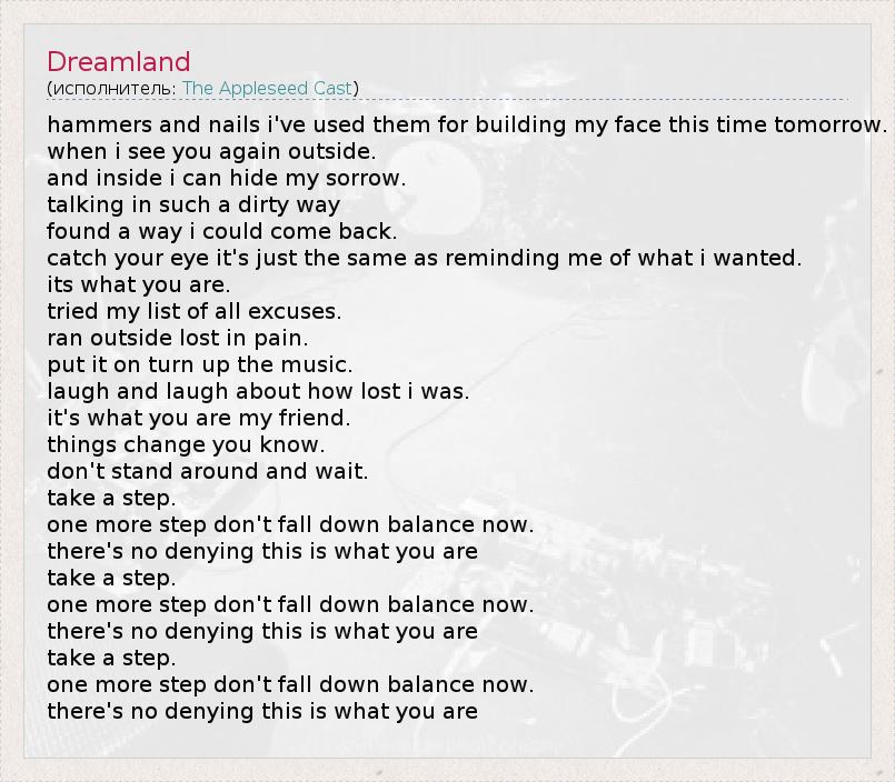Это интересно:The Appleseed Cast - группа из города Лоуренс, штат Канзас, играющая смесь из indie / emo / post-rock / alternative rock.“Основание и дебют (1997 - 1998)”Инди группа The Appleseed Cast была образована в 1997 году в Южной Калифорнии музыкантами: Christopher Crisci, Jason Wickersheim и Louie Ruiz и изначально называлась December's Tragic Drive (название коллектива - фраза, взятая из песни “Seven"... продолжение