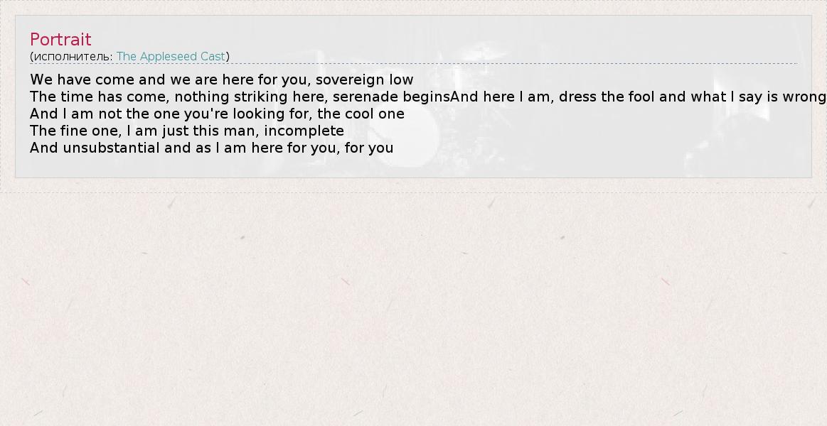 Это интересно:The Appleseed Cast - группа из города Лоуренс, штат Канзас, играющая смесь из indie / emo / post-rock / alternative rock.“Основание и дебют (1997 - 1998)”Инди группа The Appleseed Cast была образована в 1997 году в Южной Калифорнии музыкантами: Christopher Crisci, Jason Wickersheim и Louie Ruiz и изначально называлась December's Tragic Drive (название коллектива - фраза, взятая из песни “Seven"... продолжение