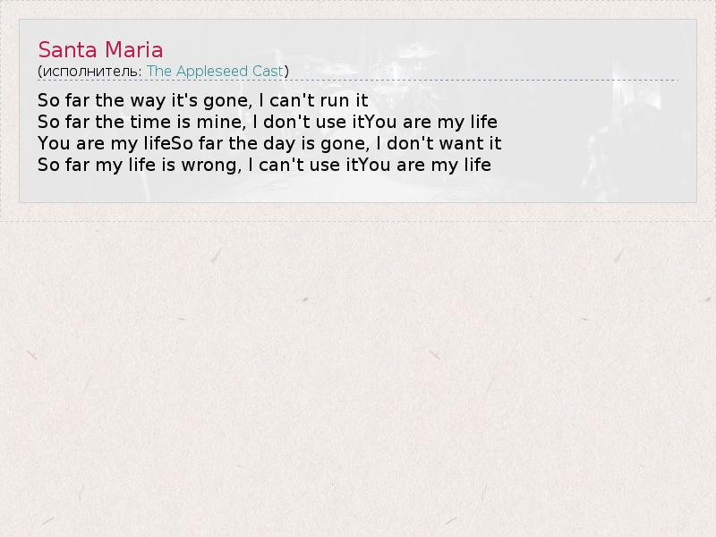 Это интересно:The Appleseed Cast - группа из города Лоуренс, штат Канзас, играющая смесь из indie / emo / post-rock / alternative rock.“Основание и дебют (1997 - 1998)”Инди группа The Appleseed Cast была образована в 1997 году в Южной Калифорнии музыкантами: Christopher Crisci, Jason Wickersheim и Louie Ruiz и изначально называлась December's Tragic Drive (название коллектива - фраза, взятая из песни “Seven"... продолжение