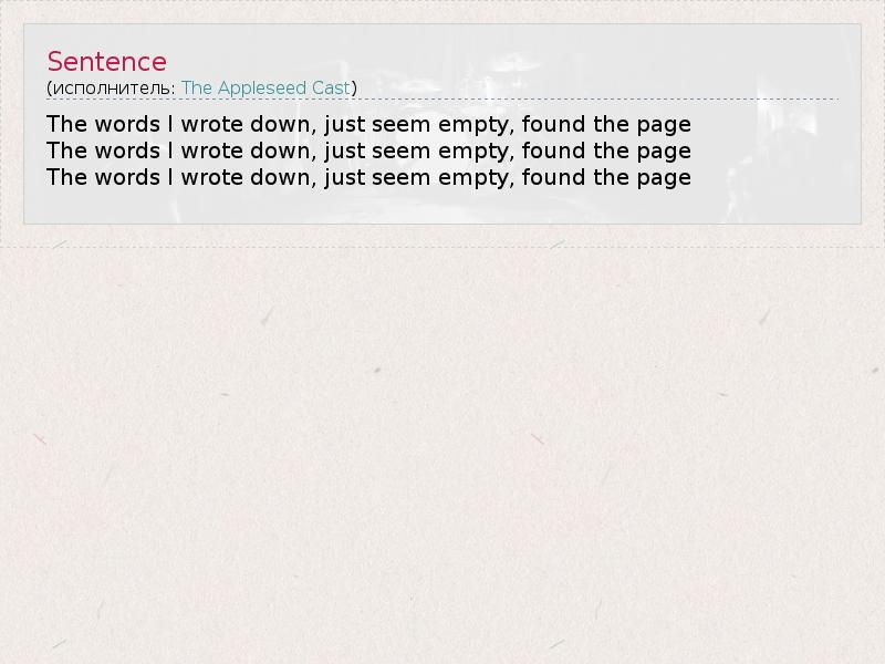 Это интересно:The Appleseed Cast - группа из города Лоуренс, штат Канзас, играющая смесь из indie / emo / post-rock / alternative rock.“Основание и дебют (1997 - 1998)”Инди группа The Appleseed Cast была образована в 1997 году в Южной Калифорнии музыкантами: Christopher Crisci, Jason Wickersheim и Louie Ruiz и изначально называлась December's Tragic Drive (название коллектива - фраза, взятая из песни “Seven"... продолжение