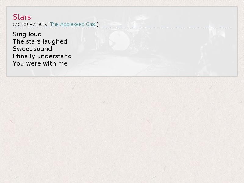 Это интересно:The Appleseed Cast - группа из города Лоуренс, штат Канзас, играющая смесь из indie / emo / post-rock / alternative rock.“Основание и дебют (1997 - 1998)”Инди группа The Appleseed Cast была образована в 1997 году в Южной Калифорнии музыкантами: Christopher Crisci, Jason Wickersheim и Louie Ruiz и изначально называлась December's Tragic Drive (название коллектива - фраза, взятая из песни “Seven"... продолжение