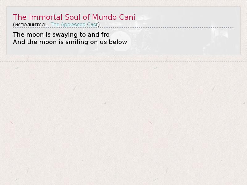 ГлавнаяИсполнителиThe Appleseed CastThe Immortal Soul of Mundo Cani