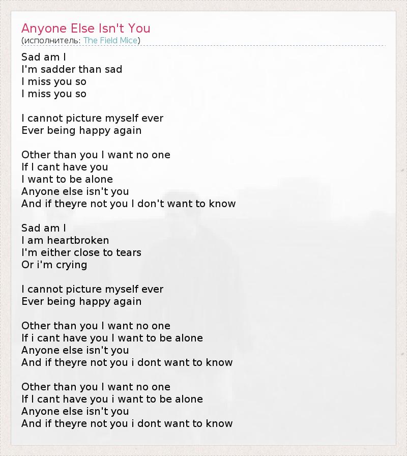 Sad am I I'm sadder than sad I miss you so I miss you so I cannot picture myself ever Ever being happy again Other than you I want no one If I cant have you I want to be alone Anyone else isn't you And if theyre not you I don't want to know Sad am I I am heartbroken I'm either close to tears Or i'm crying I cannot picture myself ever Ever being happy again Other than you I want no one If i cant have you I want to be alone Anyone else isn't you And if theyre not you i dont want to know Other than you I want no one If I cant have you i want to be alone Anyone else isn't you And if theyre not you i dont want to know