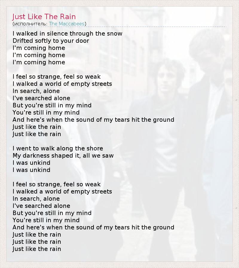 I walked in silence through the snow Drifted softly to your door I'm coming home I'm coming home I'm coming home I feel so strange, feel so weak I walked a world of empty streets In search, alone I've searched alone But you're still in my mind You're still in my mind And here's when the sound of my tears hit the ground Just like the rain Just like the rain I went to walk along the shore My darkness shaped it, all we saw I was unkind I was unkind I feel so strange, feel so weak I walked a world of empty streets In search, alone I've searched alone But you're still in my mind You're still in my mind And here's when the sound of my tears hit the ground Just like the rain Just like the rain Just like the rain
