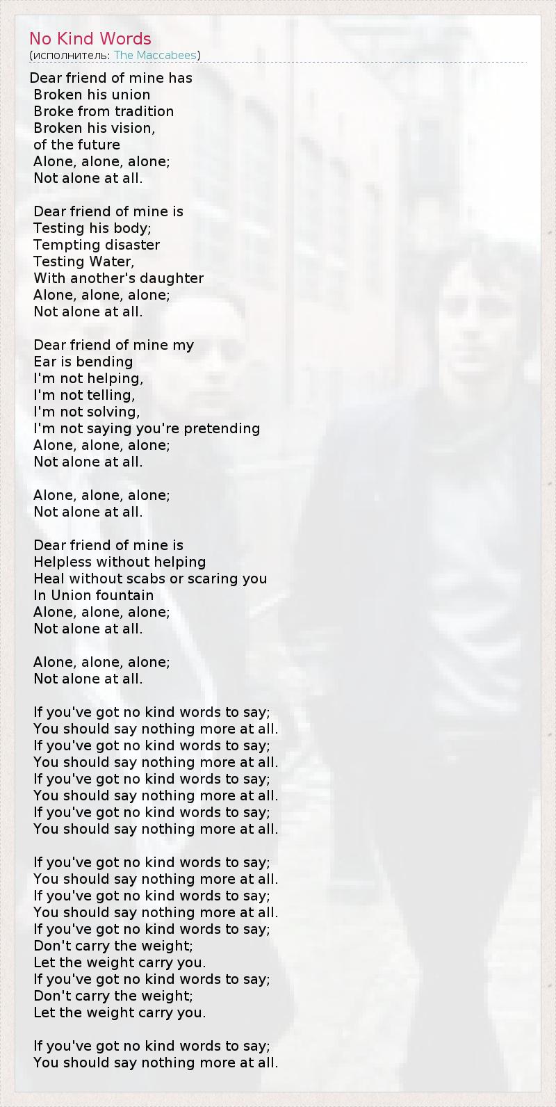 Dear friend of mine has Broken his union Broke from tradition Broken his vision, of the future Alone, alone, alone; Not alone at all. Dear friend of mine is Testing his body; Tempting disaster Testing Water, With another's daughter Alone, alone, alone; Not alone at all. Dear friend of mine my Ear is bending I'm not helping, I'm not telling, I'm not solving, I'm not saying you're pretending Alone, alone, alone; Not alone at all. Alone, alone, alone; Not alone at all. Dear friend of mine is Helpless without helping Heal without scabs or scaring you In Union fountain Alone, alone, alone; Not alone at all. Alone, alone, alone; Not alone at all. If you've got no kind words to say; You should say nothing more at all. If you've got no kind words to say; You should say nothing more at all. If you've got no kind words to say; You should say nothing more at all. If you've got no kind words to say; You should say nothing more at all. If you've got no kind words to say; You should say nothing more at all. If you've got no kind words to say; You should say nothing more at all. If you've got no kind words to say; Don't carry the weight; Let the weight carry you. If you've got no kind words to say; Don't carry the weight; Let the weight carry you. If you've got no kind words to say; You should say nothing more at all.