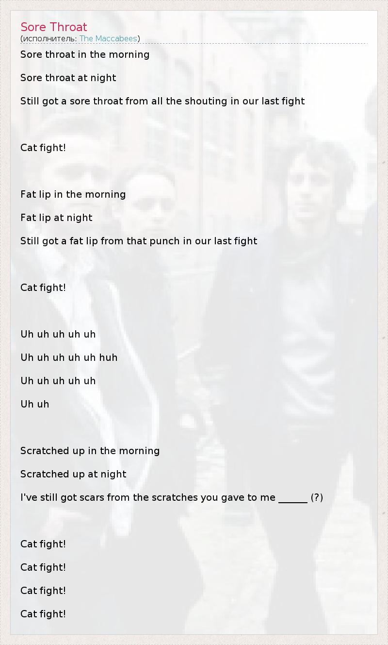 Sore throat in the morning Sore throat at night Still got a sore throat from all the shouting in our last fight Cat fight! Fat lip in the morning Fat lip at night Still got a fat lip from that punch in our last fight Cat fight! Uh uh uh uh uh Uh uh uh uh uh huh Uh uh uh uh uh Uh uh Scratched up in the morning Scratched up at night I've still got scars from the scratches you gave to me ______ (?) Cat fight! Cat fight! Cat fight! Cat fight!