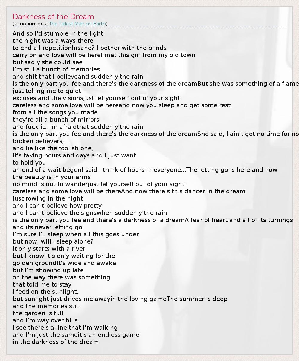 is the only part you feeland there's a darkness of a dreamA fear of heart and all of its turnings