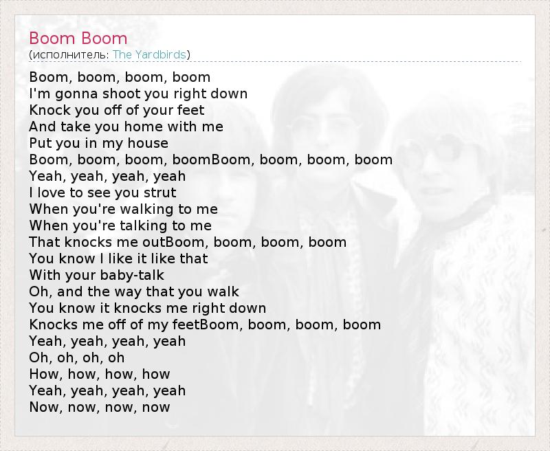 Boom, boom, boom, boom I'm gonna shoot you right down Knock you off of your feet And take you home with me Put you in my house Boom, boom, boom, boomBoom, boom, boom, boom Yeah, yeah, yeah, yeah I love to see you strut When you're walking to me When you're talking to me That knocks me outBoom, boom, boom, boom You know I like it like that With your baby-talk Oh, and the way that you walk You know it knocks me right down Knocks me off of my feetBoom, boom, boom, boom Yeah, yeah, yeah, yeah Oh, oh, oh, oh How, how, how, how Yeah, yeah, yeah, yeah Now, now, now, now