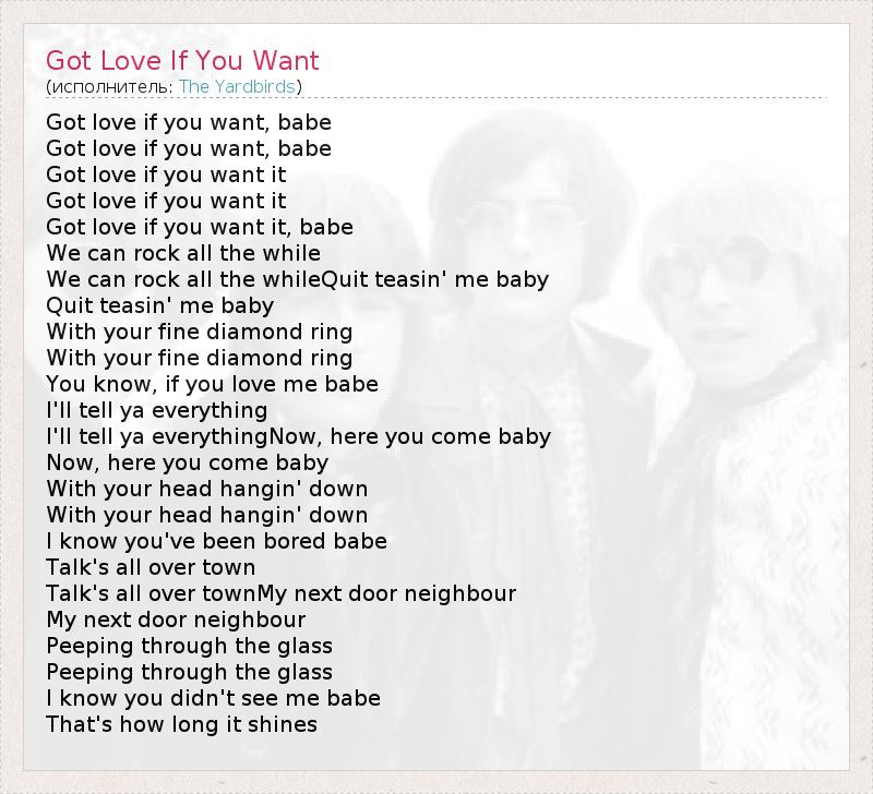 Got love if you want, babe Got love if you want, babe Got love if you want it Got love if you want it Got love if you want it, babe We can rock all the while We can rock all the whileQuit teasin' me baby Quit teasin' me baby With your fine diamond ring With your fine diamond ring You know, if you love me babe I'll tell ya everything I'll tell ya everythingNow, here you come baby Now, here you come baby With your head hangin' down With your head hangin' down I know you've been bored babe Talk's all over town Talk's all over townMy next door neighbour My next door neighbour Peeping through the glass Peeping through the glass I know you didn't see me babe That's how long it shines