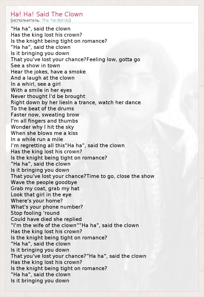 "Ha ha", said the clown Has the king lost his crown? Is the knight being tight on romance? "Ha ha", said the clown Is it bringing you down That you've lost your chance?Feeling low, gotta go See a show in town Hear the jokes, have a smoke And a laugh at the clown In a whirl, see a girl With a smile in her eyes Never thought I'd be brought Right down by her liesIn a trance, watch her dance To the beat of the drums Faster now, sweating brow I'm all fingers and thumbs Wonder why I hit the sky When she blows me a kiss In a while run a mile I'm regretting all this"Ha ha", said the clown Has the king lost his crown? Is the knight being tight on romance? "Ha ha", said the clown Is it bringing you down That you've lost your chance?Time to go, close the show Wave the people goodbye Grab my coat, grab my hat Look that girl in the eye Where's your home? What's your phone number? Stop fooling 'round Could have died she replied "I'm the wife of the clown""Ha ha", said the clown Has the king lost his crown? Is the knight being tight on romance? "Ha ha", said the clown Is it bringing you down That you've lost your chance?"Ha ha", said the clown Has the king lost his crown? Is the knight being tight on romance? "Ha ha", said the clown Is it bringing you down