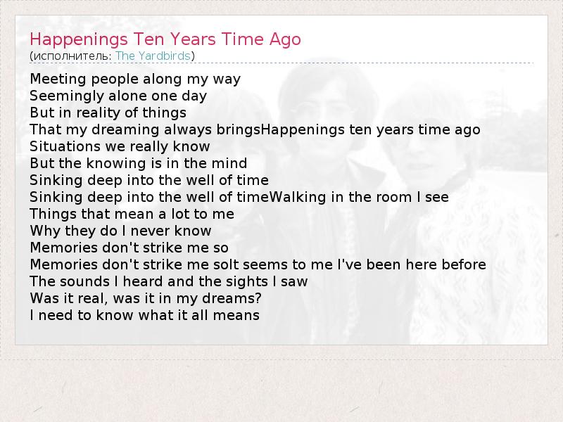 А как ты думаешь, о чем песня "Happenings Ten Years Time Ago" ?