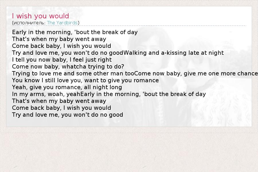 Early in the morning, 'bout the break of day That's when my baby went away Come back baby, I wish you would Try and love me, you won't do no goodWalking and a-kissing late at night I tell you now baby, I feel just right Come now baby, whatcha trying to do? Trying to love me and some other man tooCome now baby, give me one more chance You know I still love you, want to give you romance Yeah, give you romance, all night long In my arms, woah, yeahEarly in the morning, 'bout the break of day That's when my baby went away Come back baby, I wish you would Try and love me, you won't do no good