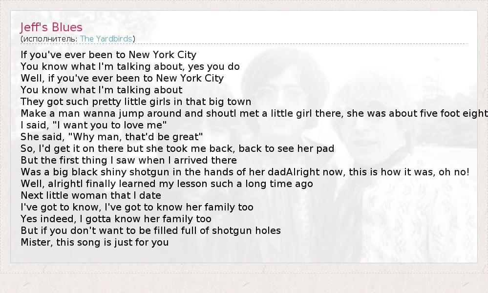 If you've ever been to New York City You know what I'm talking about, yes you do Well, if you've ever been to New York City You know what I'm talking about They got such pretty little girls in that big town Make a man wanna jump around and shoutI met a little girl there, she was about five foot eight I said, "I want you to love me" She said, "Why man, that'd be great" So, I'd get it on there but she took me back, back to see her pad But the first thing I saw when I arrived there Was a big black shiny shotgun in the hands of her dadAlright now, this is how it was, oh no! Well, alrightI finally learned my lesson such a long time ago Next little woman that I date I've got to know, I've got to know her family too Yes indeed, I gotta know her family too But if you don't want to be filled full of shotgun holes Mister, this song is just for you