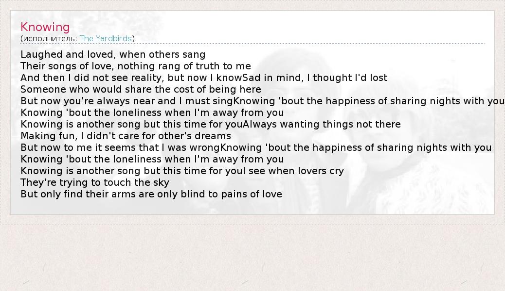 Laughed and loved, when others sang Their songs of love, nothing rang of truth to me And then I did not see reality, but now I knowSad in mind, I thought I'd lost Someone who would share the cost of being here But now you're always near and I must singKnowing 'bout the happiness of sharing nights with you Knowing 'bout the loneliness when I'm away from you Knowing is another song but this time for youAlways wanting things not there Making fun, I didn't care for other's dreams But now to me it seems that I was wrongKnowing 'bout the happiness of sharing nights with you Knowing 'bout the loneliness when I'm away from you Knowing is another song but this time for youI see when lovers cry They're trying to touch the sky But only find their arms are only blind to pains of love