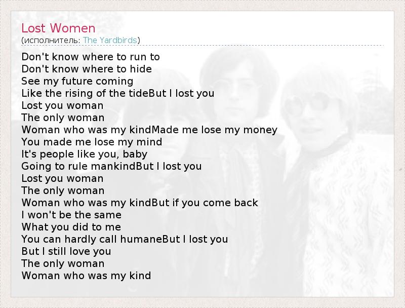 Don't know where to run to Don't know where to hide See my future coming Like the rising of the tideBut I lost you Lost you woman The only woman Woman who was my kindMade me lose my money You made me lose my mind It's people like you, baby Going to rule mankindBut I lost you Lost you woman The only woman Woman who was my kindBut if you come back I won't be the same What you did to me You can hardly call humaneBut I lost you But I still love you The only woman Woman who was my kind