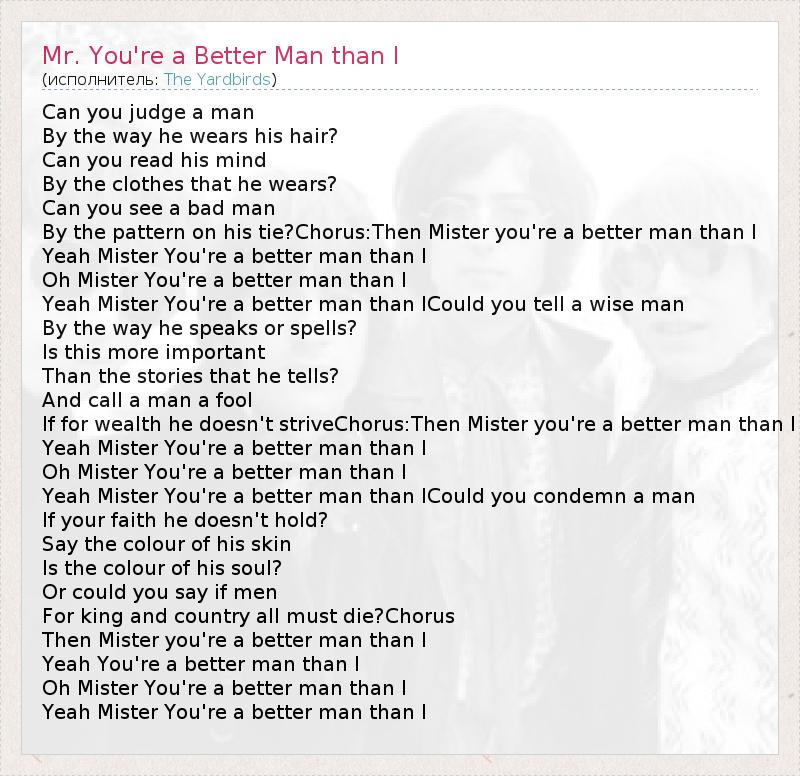 А как ты думаешь, о чем песня "Mr. You're a Better Man than I" ?