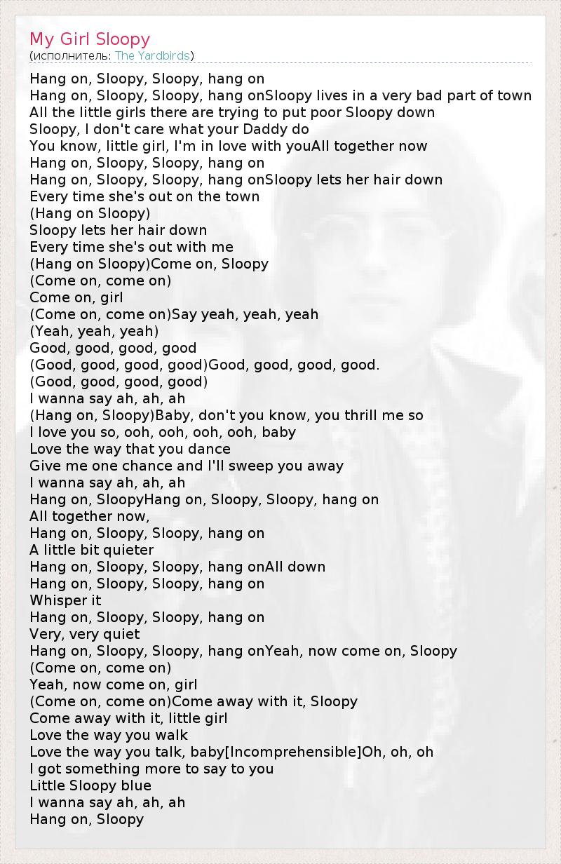 Hang on, Sloopy, Sloopy, hang on Hang on, Sloopy, Sloopy, hang onSloopy lives in a very bad part of town All the little girls there are trying to put poor Sloopy down Sloopy, I don't care what your Daddy do You know, little girl, I'm in love with youAll together now Hang on, Sloopy, Sloopy, hang on Hang on, Sloopy, Sloopy, hang onSloopy lets her hair down Every time she's out on the town (Hang on Sloopy) Sloopy lets her hair down Every time she's out with me (Hang on Sloopy)Come on, Sloopy (Come on, come on) Come on, girl (Come on, come on)Say yeah, yeah, yeah (Yeah, yeah, yeah) Good, good, good, good (Good, good, good, good)Good, good, good, good. (Good, good, good, good) I wanna say ah, ah, ah (Hang on, Sloopy)Baby, don't you know, you thrill me so I love you so, ooh, ooh, ooh, ooh, baby Love the way that you dance Give me one chance and I'll sweep you away I wanna say ah, ah, ah Hang on, SloopyHang on, Sloopy, Sloopy, hang on All together now, Hang on, Sloopy, Sloopy, hang on A little bit quieter Hang on, Sloopy, Sloopy, hang onAll down Hang on, Sloopy, Sloopy, hang on Whisper it Hang on, Sloopy, Sloopy, hang on Very, very quiet Hang on, Sloopy, Sloopy, hang onYeah, now come on, Sloopy (Come on, come on) Yeah, now come on, girl (Come on, come on)Come away with it, Sloopy Come away with it, little girl Love the way you walk Love the way you talk, baby[Incomprehensible]Oh, oh, oh I got something more to say to you Little Sloopy blue I wanna say ah, ah, ah Hang on, Sloopy