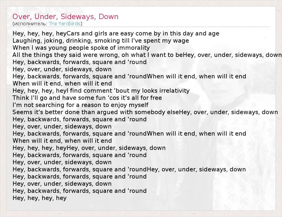 Hey, hey, hey, heyCars and girls are easy come by in this day and age Laughing, joking, drinking, smoking till I've spent my wage When I was young people spoke of immorality All the things they said were wrong, oh what I want to beHey, over, under, sideways, down Hey, backwards, forwards, square and 'round Hey, over, under, sideways, down Hey, backwards, forwards, square and 'roundWhen will it end, when will it end When will it end, when will it end Hey, hey, hey, heyI find comment 'bout my looks irrelativity Think I'll go and have some fun 'cos it's all for free I'm not searching for a reason to enjoy myself Seems it's better done than argued with somebody elseHey, over, under, sideways, down Hey, backwards, forwards, square and 'round Hey, over, under, sideways, down Hey, backwards, forwards, square and 'roundWhen will it end, when will it end When will it end, when will it end Hey, hey, hey, heyHey, over, under, sideways, down Hey, backwards, forwards, square and 'round Hey, over, under, sideways, down Hey, backwards, forwards, square and 'roundHey, over, under, sideways, down Hey, backwards, forwards, square and 'round Hey, over, under, sideways, down Hey, backwards, forwards, square and 'round Hey, hey, hey, hey