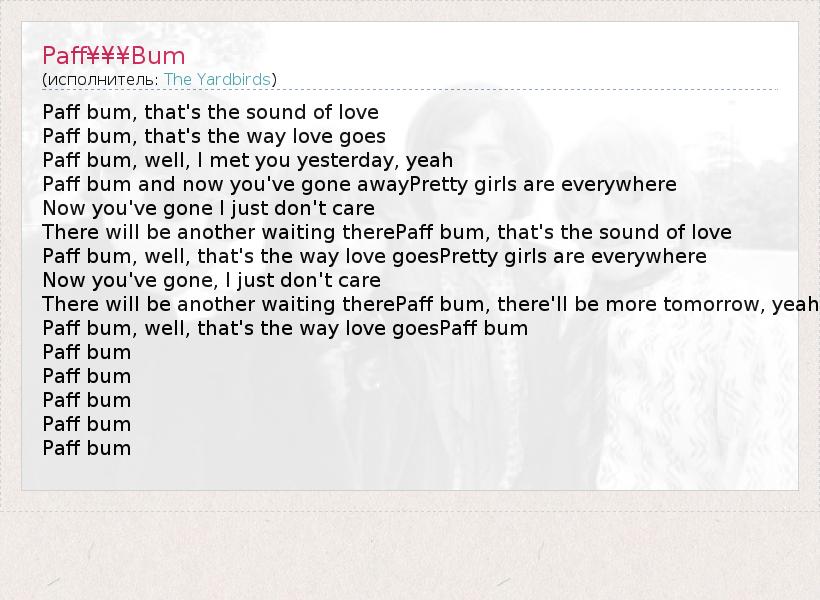 Paff bum, that's the sound of love Paff bum, that's the way love goes Paff bum, well, I met you yesterday, yeah Paff bum and now you've gone awayPretty girls are everywhere Now you've gone I just don't care There will be another waiting therePaff bum, that's the sound of love Paff bum, well, that's the way love goesPretty girls are everywhere Now you've gone, I just don't care There will be another waiting therePaff bum, there'll be more tomorrow, yeah Paff bum, well, that's the way love goesPaff bum Paff bum Paff bum Paff bum Paff bum Paff bum