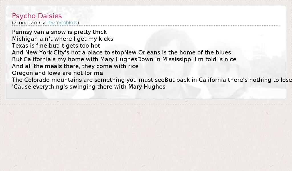 Это интересно:The Yardbirds главным образом известна как отправная точка для творчества трех величайших гитаристов: Эрика Клэптона (Eric Clapton), Джеффа Бека (Jeff Beck) и Джимми Пэйджа (Jimmy Page). Несомненно, влияние этих личностей на развитие рок-музыки огромно, и они и по сей день пребывают в числе наиболее авторитетных и уважаемых инструменталистов, но и вклад The Yardbirds в современную рок-культуру также нельзя недооценивать.... продолжение