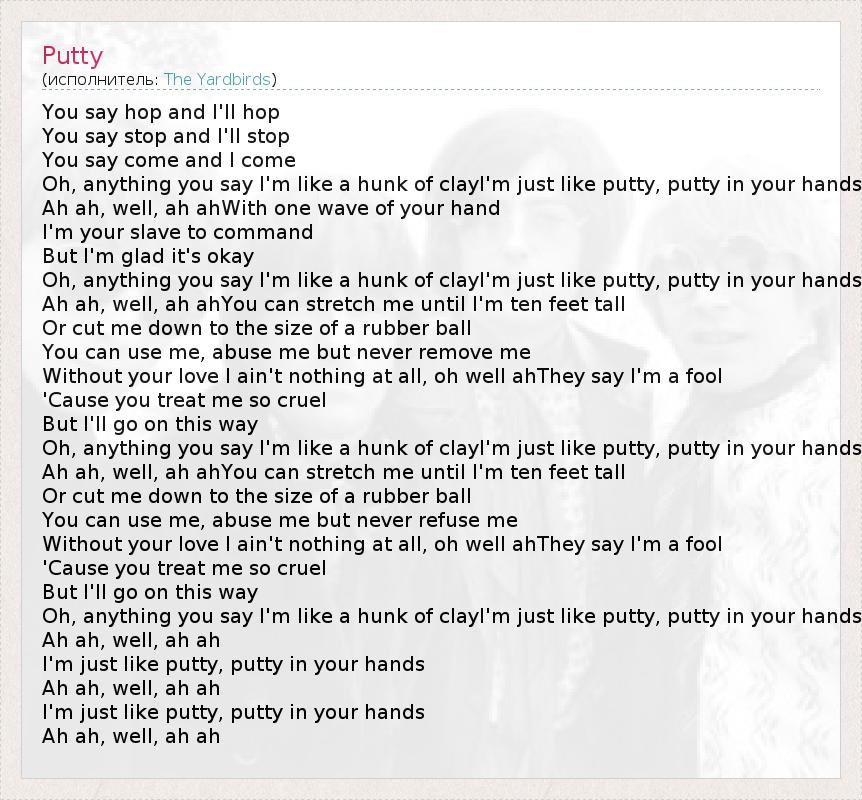 You say hop and I'll hop You say stop and I'll stop You say come and I come Oh, anything you say I'm like a hunk of clayI'm just like putty, putty in your hands Ah ah, well, ah ahWith one wave of your hand I'm your slave to command But I'm glad it's okay Oh, anything you say I'm like a hunk of clayI'm just like putty, putty in your hands Ah ah, well, ah ahYou can stretch me until I'm ten feet tall Or cut me down to the size of a rubber ball You can use me, abuse me but never remove me Without your love I ain't nothing at all, oh well ahThey say I'm a fool 'Cause you treat me so cruel But I'll go on this way Oh, anything you say I'm like a hunk of clayI'm just like putty, putty in your hands Ah ah, well, ah ahYou can stretch me until I'm ten feet tall Or cut me down to the size of a rubber ball You can use me, abuse me but never refuse me Without your love I ain't nothing at all, oh well ahThey say I'm a fool 'Cause you treat me so cruel But I'll go on this way Oh, anything you say I'm like a hunk of clayI'm just like putty, putty in your hands Ah ah, well, ah ah I'm just like putty, putty in your hands Ah ah, well, ah ah I'm just like putty, putty in your hands Ah ah, well, ah ah