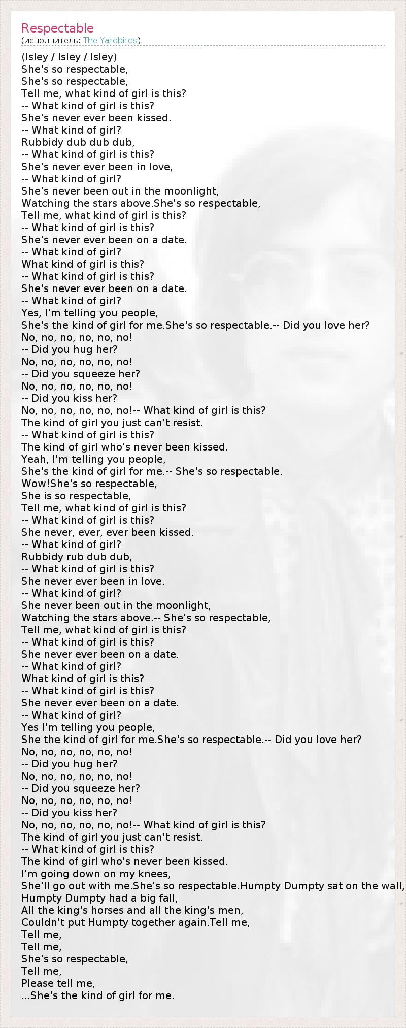 (Isley / Isley / Isley) She's so respectable, She's so respectable, Tell me, what kind of girl is this? -- What kind of girl is this? She's never ever been kissed. -- What kind of girl? Rubbidy dub dub dub, -- What kind of girl is this? She's never ever been in love, -- What kind of girl? She's never been out in the moonlight, Watching the stars above.She's so respectable, Tell me, what kind of girl is this? -- What kind of girl is this? She's never ever been on a date. -- What kind of girl? What kind of girl is this? -- What kind of girl is this? She's never ever been on a date. -- What kind of girl? Yes, I'm telling you people, She's the kind of girl for me.She's so respectable.-- Did you love her? No, no, no, no, no, no! -- Did you hug her? No, no, no, no, no, no! -- Did you squeeze her? No, no, no, no, no, no! -- Did you kiss her? No, no, no, no, no, no!-- What kind of girl is this? The kind of girl you just can't resist. -- What kind of girl is this? The kind of girl who's never been kissed. Yeah, I'm telling you people, She's the kind of girl for me.-- She's so respectable. Wow!She's so respectable, She is so respectable, Tell me, what kind of girl is this? -- What kind of girl is this? She never, ever, ever been kissed. -- What kind of girl? Rubbidy rub dub dub, -- What kind of girl is this? She never ever been in love. -- What kind of girl? She never been out in the moonlight, Watching the stars above.-- She's so respectable, Tell me, what kind of girl is this? -- What kind of girl is this? She never ever been on a date. -- What kind of girl? What kind of girl is this? -- What kind of girl is this? She never ever been on a date. -- What kind of girl? Yes I'm telling you people, She the kind of girl for me.She's so respectable.-- Did you love her? No, no, no, no, no, no! -- Did you hug her? No, no, no, no, no, no! -- Did you squeeze her? No, no, no, no, no, no! -- Did you kiss her? No, no, no, no, no, no!-- What kind of girl is this? The kind of girl you just can't resist. -- What kind of girl is this? The kind of girl who's never been kissed. I'm going down on my knees, She'll go out with me.She's so respectable.Humpty Dumpty sat on the wall, Humpty Dumpty had a big fall, All the king's horses and all the king's men, Couldn't put Humpty together again.Tell me, Tell me, Tell me, She's so respectable, Tell me, Please tell me, ...She's the kind of girl for me.