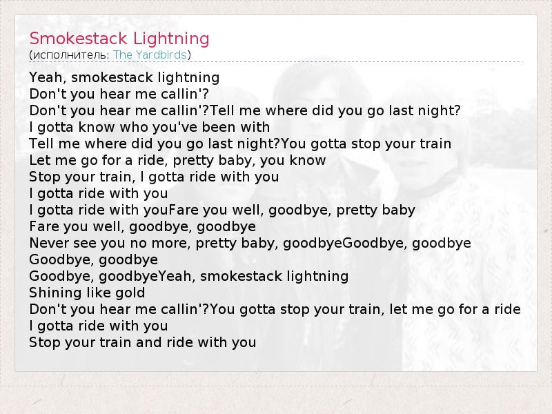 Yeah, smokestack lightning Don't you hear me callin'? Don't you hear me callin'?Tell me where did you go last night? I gotta know who you've been with Tell me where did you go last night?You gotta stop your train Let me go for a ride, pretty baby, you know Stop your train, I gotta ride with you I gotta ride with you I gotta ride with youFare you well, goodbye, pretty baby Fare you well, goodbye, goodbye Never see you no more, pretty baby, goodbyeGoodbye, goodbye Goodbye, goodbye Goodbye, goodbyeYeah, smokestack lightning Shining like gold Don't you hear me callin'?You gotta stop your train, let me go for a ride I gotta ride with you Stop your train and ride with you