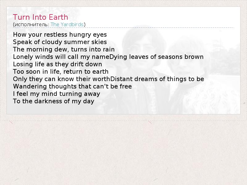 А как ты думаешь, о чем песня "Turn Into Earth" ?