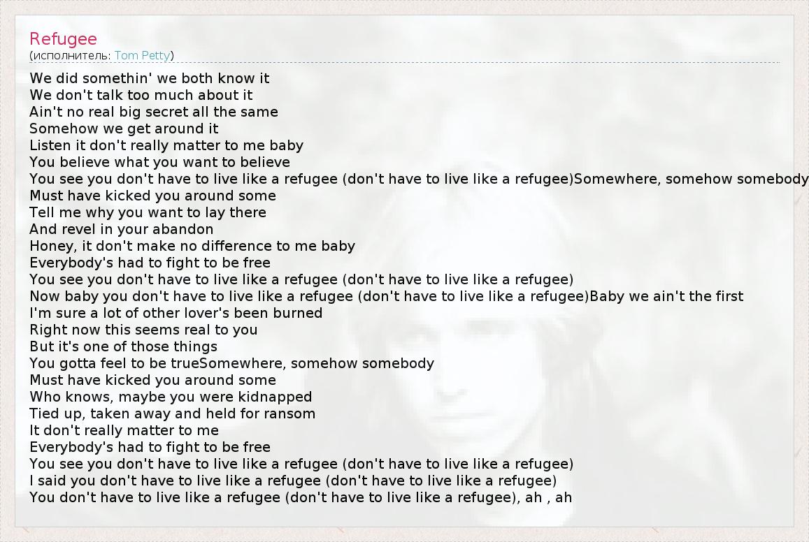 We did somethin' we both know it We don't talk too much about it Ain't no real big secret all the same Somehow we get around it Listen it don't really matter to me baby You believe what you want to believe You see you don't have to live like a refugee (don't have to live like a refugee)Somewhere, somehow somebody Must have kicked you around some Tell me why you want to lay there And revel in your abandon Honey, it don't make no difference to me baby Everybody's had to fight to be free You see you don't have to live like a refugee (don't have to live like a refugee) Now baby you don't have to live like a refugee (don't have to live like a refugee)Baby we ain't the first I'm sure a lot of other lover's been burned Right now this seems real to you But it's one of those things You gotta feel to be trueSomewhere, somehow somebody Must have kicked you around some Who knows, maybe you were kidnapped Tied up, taken away and held for ransom It don't really matter to me Everybody's had to fight to be free You see you don't have to live like a refugee (don't have to live like a refugee) I said you don't have to live like a refugee (don't have to live like a refugee) You don't have to live like a refugee (don't have to live like a refugee), ah , ah