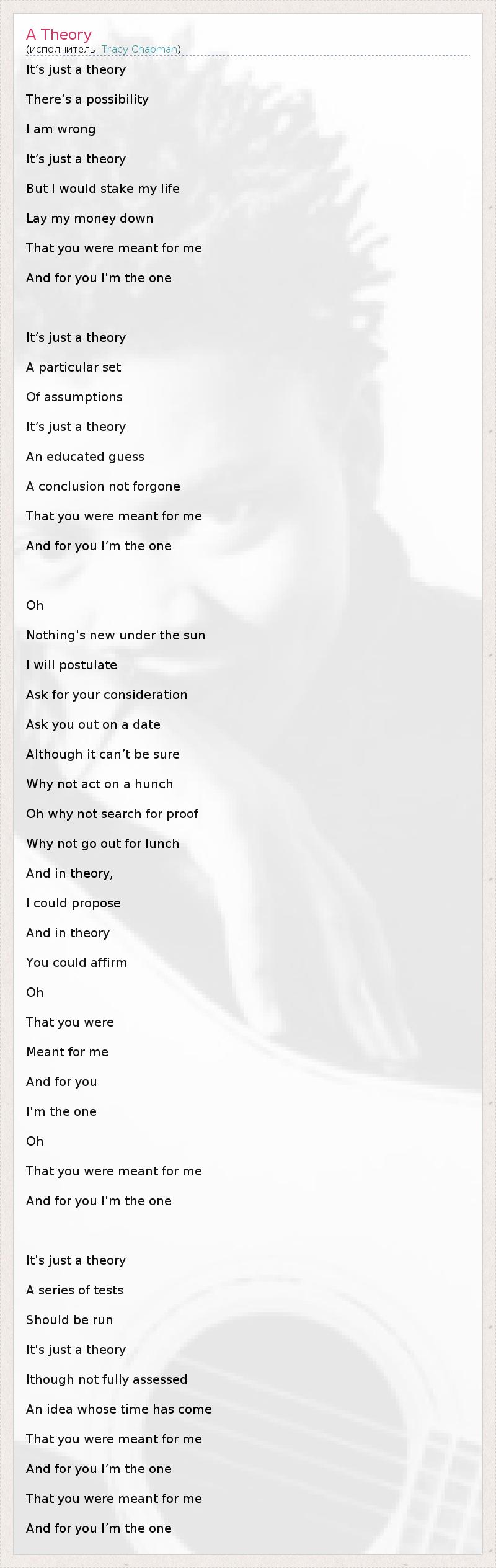 It’s just a theory There’s a possibility I am wrong It’s just a theory But I would stake my life Lay my money down That you were meant for me And for you I'm the one It’s just a theory A particular set Of assumptions It’s just a theory An educated guess A conclusion not forgone That you were meant for me And for you I’m the one Oh Nothing's new under the sun I will postulate Ask for your consideration Ask you out on a date Although it can’t be sure Why not act on a hunch Oh why not search for proof Why not go out for lunch And in theory, I could propose And in theory You could affirm Oh That you were Meant for me And for you I'm the one Oh That you were meant for me And for you I'm the one It's just a theory A series of tests Should be run It's just a theory lthough not fully assessed An idea whose time has come That you were meant for me And for you I’m the one That you were meant for me And for you I’m the one