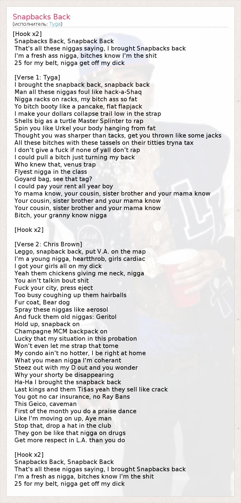[Припев x2] Снепбек возвращается, Снепбек возвращается Все ниггеры говорят, я вернул снепбек назад Я свеж и оригинален, сучки знают, что я крут 25к за мой пояс, отойди от моего члена [Куплет 1: Tyga] Я вернул снепбек назад, назад Чувак, все эти ниггеры фолят как на Шаке Нигга у меня куча бабла, задница моей сучки такая толстая Эй, грудь у сучки как блин, плоская лепешка Ваши доллары улетучиваются, торчат аж из моего ремня Броня большая как у черепахи учителя Сплинтера Закружу тебя как Urkel, с твоего тела свисает жирок Думал ты острее кнопок, брошу тебя как в игре в бабки Все эти сучки с кисточками на сосках пытаются меня обобрать Мне насрать, читает ли одна из них рэп Я могу подцепить сучку, просто повернувшись спиной Кто знал, что это венерина мухоловка Для летящего ниггера Рюкзак от Goyard, видишь эту этикетку? Я мог бы оплатить им твою аренду за год Эй мама знает, твой кузен, сестра, брат и твоя мама знают Твой кузен, сестра, брат и твоя мама знают Твой кузен, сестра, брат и твоя мама знают Сучка, твоя бабуля знает, что [Припев x2] [Куплет 2: Chris Brown] Вперед, снепбек возвращается, я популяризовал Вирджинию Я - молодой ниггер, сердцеед, от меня у девок сердечные приступы Все ваши девки на моем члене Да, цыпочки, делают мне минет Не несите дерьма Нахер ваш город, нажмите извлечь Я слишком занят отхаркиванием их волосяных шариков Меховое пальто из медвежьей собаки Распыляю эти ниггеров как аэрозоль И нахер старых ниггеров с Geritol** Погодите, надену снепбек Запихиваю шампанское в рюкзак MCM Вам везет, что я на испытательном сроке Никогда не позволяйте мне обзавестись Томпсоном В моем доме не стало жарче, я буду дома *** Что ты имеешь в виду ниггер, я не несу бреда Мой член так и торчит, а ты ещё спрашиваешь Почему твоя малышка исчезает Ха ха, я вернул снепбек назад Линии одежды Last kings и Ti$as, стали продаваться как наркота У тебя нет ни автострахования, ни очков Ray Bans Этот брэнд Geico доисторический Вначале месяца ты танцуешь хвалебный танец Как будто я иду вверх, О да Прекращай это, брось шляпу в клубе Они вытаращат глаза как ниггер на наркоте Получи больше уважения в Лос-Анджелесе [Припев x2] Снепбек возвращается, Снепбек возвращается Все ниггеры говорят, я вернул снепбек назад Я свеж и оригинален, сучки знают, что я крут 25к за мой пояс, отойди от моего члена * - кепка с плоским козырьком и защёлкой сзади, была популяризована рэперами в начале 90-х ** - американская торговая марка различных пищевых добавок, взявшее название от гериатрии *** - Крис попал под огонь, после некоторых заявлений