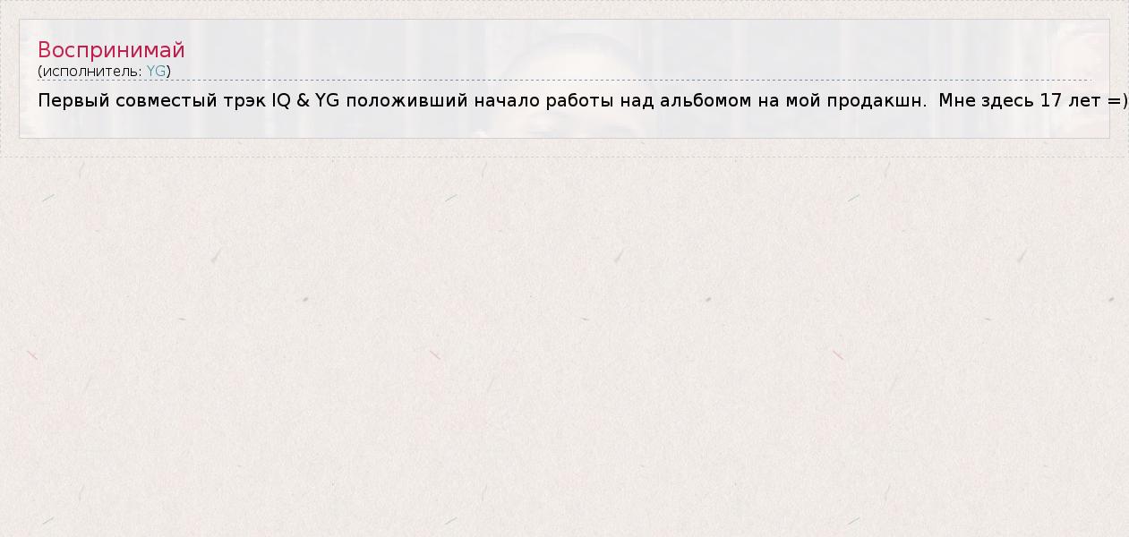 Первый совместый трэк IQ & YG положивший начало работы над альбомом на мой продакшн.  Мне здесь 17 лет =)