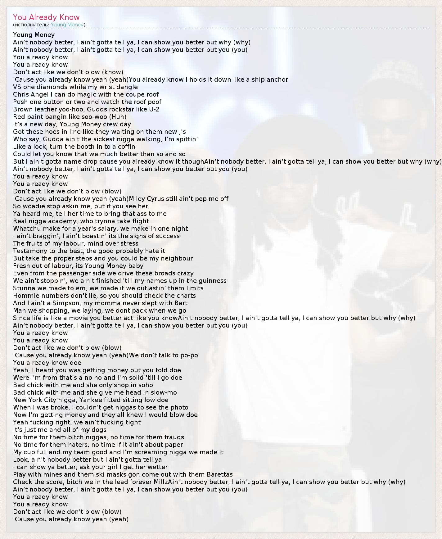 But I ain't gotta name drop cause you already know it thoughAin't nobody better, I ain't gotta tell ya, I can show you better but why (why)