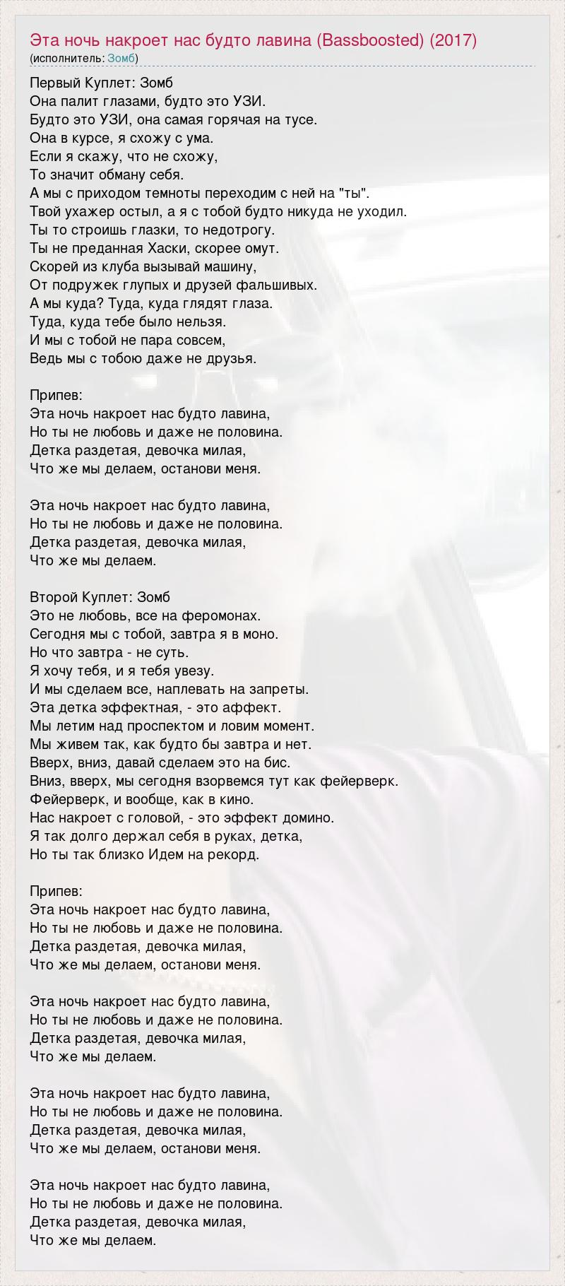 Первый Куплет: Зомб Она палит глазами, будто это УЗИ. Будто это УЗИ, она самая горячая на тусе. Она в курсе, я схожу с ума. Если я скажу, что не схожу, То значит обману себя. А мы с приходом темноты переходим с ней на "ты". Твой ухажер остыл, а я с тобой будто никуда не уходил. Ты то строишь глазки, то недотрогу. Ты не преданная Хаски, скорее омут. Скорей из клуба вызывай машину, От подружек глупых и друзей фальшивых. А мы куда? Туда, куда глядят глаза. Туда, куда тебе было нельзя. И мы с тобой не пара совсем, Ведь мы с тобою даже не друзья. Припев: Эта ночь накроет нас будто лавина, Но ты не любовь и даже не половина. Детка раздетая, девочка милая, Что же мы делаем, останови меня. Эта ночь накроет нас будто лавина, Но ты не любовь и даже не половина. Детка раздетая, девочка милая, Что же мы делаем. Второй Куплет: Зомб Это не любовь, все на феромонах. Сегодня мы с тобой, завтра я в моно. Но что завтра - не суть. Я хочу тебя, и я тебя увезу. И мы сделаем все, наплевать на запреты. Эта детка эффектная, - это аффект. Мы летим над проспектом и ловим момент. Мы живем так, как будто бы завтра и нет. Вверх, вниз, давай сделаем это на бис. Вниз, вверх, мы сегодня взорвемся тут как фейерверк. Фейерверк, и вообще, как в кино. Нас накроет с головой, - это эффект домино. Я так долго держал себя в руках, детка, Но ты так близко Идем на рекорд. Припев: Эта ночь накроет нас будто лавина, Но ты не любовь и даже не половина. Детка раздетая, девочка милая, Что же мы делаем, останови меня. Эта ночь накроет нас будто лавина, Но ты не любовь и даже не половина. Детка раздетая, девочка милая, Что же мы делаем. Эта ночь накроет нас будто лавина, Но ты не любовь и даже не половина. Детка раздетая, девочка милая, Что же мы делаем, останови меня. Эта ночь накроет нас будто лавина, Но ты не любовь и даже не половина. Детка раздетая, девочка милая, Что же мы делаем.