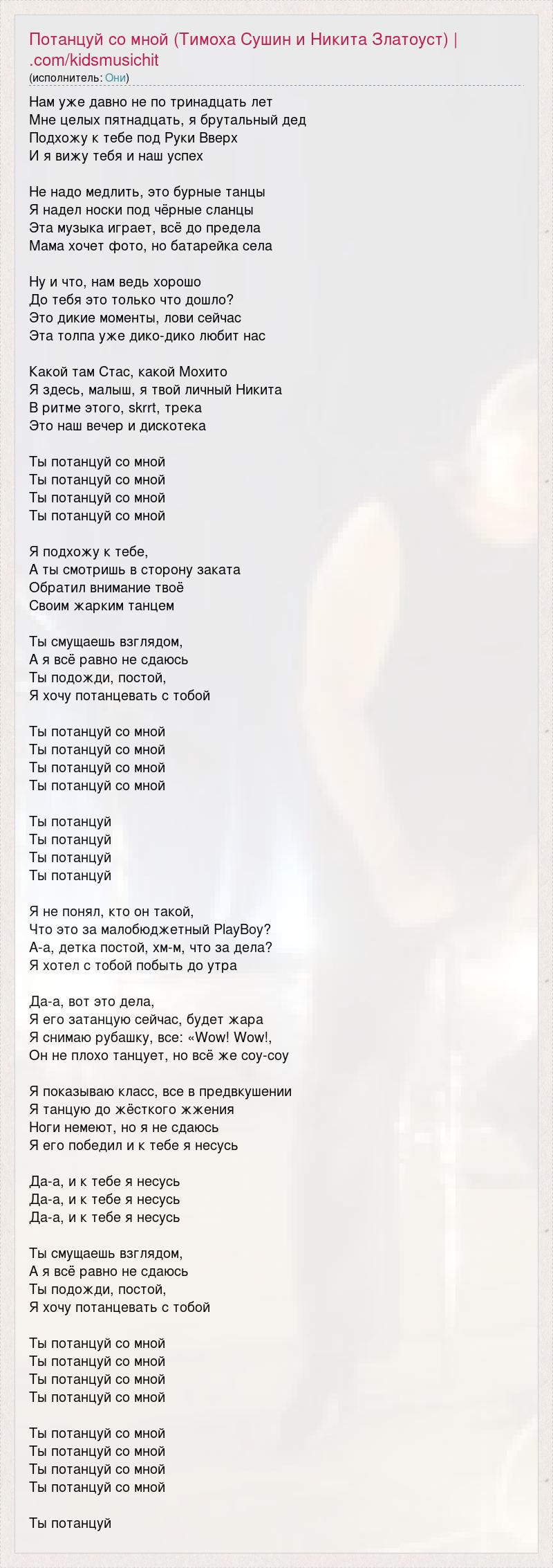 Нам уже давно не по тринадцать лет Мне целых пятнадцать, я брутальный дед Подхожу к тебе под Руки Вверх И я вижу тебя и наш успех Не надо медлить, это бурные танцы Я надел носки под чёрные сланцы Эта музыка играет, всё до предела Мама хочет фото, но батарейка села Ну и что, нам ведь хорошо До тебя это только что дошло? Это дикие моменты, лови сейчас Эта толпа уже дико-дико любит нас Какой там Стас, какой Мохито Я здесь, малыш, я твой личный Никита В ритме этого, skrrt, трека Это наш вечер и дискотека Ты потанцуй со мной Ты потанцуй со мной Ты потанцуй со мной Ты потанцуй со мной Я подхожу к тебе, А ты смотришь в сторону заката Обратил внимание твоё Своим жарким танцем Ты смущаешь взглядом, А я всё равно не сдаюсь Ты подожди, постой, Я хочу потанцевать с тобой Ты потанцуй со мной Ты потанцуй со мной Ты потанцуй со мной Ты потанцуй со мной Ты потанцуй Ты потанцуй Ты потанцуй Ты потанцуй Я не понял, кто он такой, Что это за малобюджетный PlayBoy? А-а, детка постой, хм-м, что за дела? Я хотел с тобой побыть до утра Да-а, вот это дела, Я его затанцую сейчас, будет жара Я снимаю рубашку, все: «Wow! Wow!, Он не плохо танцует, но всё же соу-соу Я показываю класс, все в предвкушении Я танцую до жёсткого жжения Ноги немеют, но я не сдаюсь Я его победил и к тебе я несусь Да-а, и к тебе я несусь Да-а, и к тебе я несусь Да-а, и к тебе я несусь Ты смущаешь взглядом, А я всё равно не сдаюсь Ты подожди, постой, Я хочу потанцевать с тобой Ты потанцуй со мной Ты потанцуй со мной Ты потанцуй со мной Ты потанцуй со мной Ты потанцуй со мной Ты потанцуй со мной Ты потанцуй со мной Ты потанцуй со мной Ты потанцуй