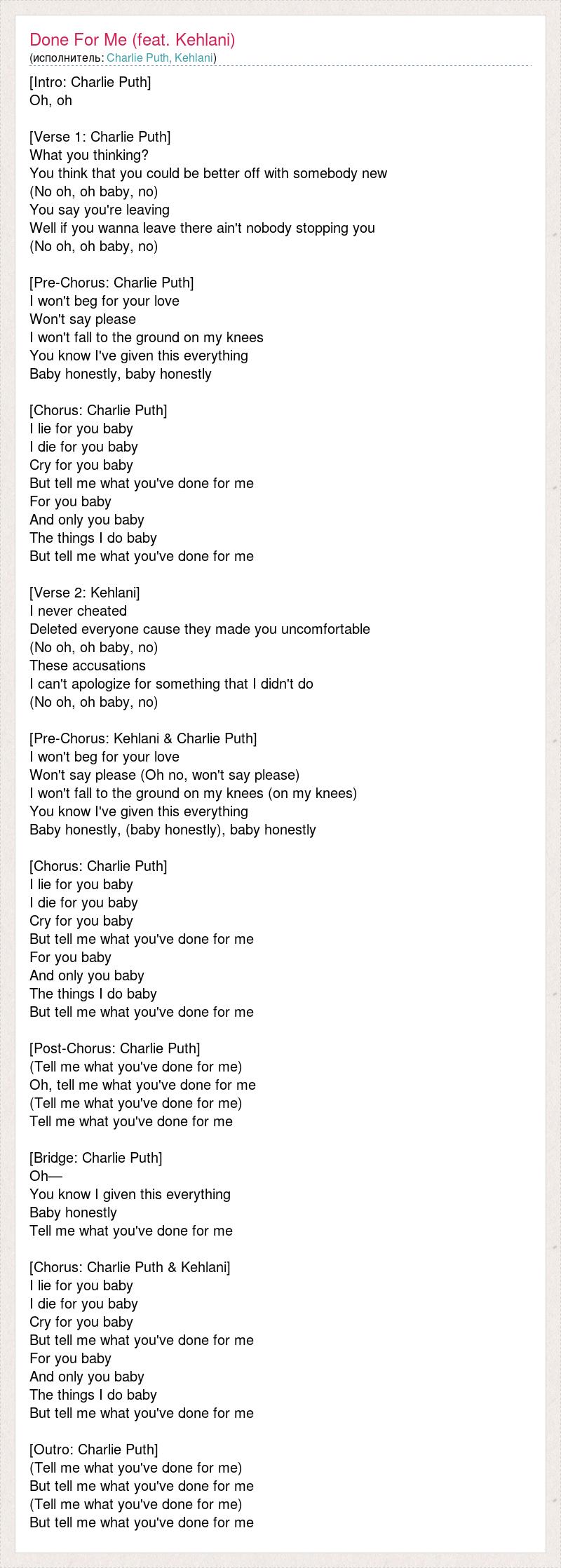 [Intro: Charlie Puth] Oh, oh [Verse 1: Charlie Puth] What you thinking? You think that you could be better off with somebody new (No oh, oh baby, no) You say you're leaving Well if you wanna leave there ain't nobody stopping you (No oh, oh baby, no) [Pre-Chorus: Charlie Puth] I won't beg for your love Won't say please I won't fall to the ground on my knees You know I've given this everything Baby honestly, baby honestly [Chorus: Charlie Puth] I lie for you baby I die for you baby Cry for you baby But tell me what you've done for me For you baby And only you baby The things I do baby But tell me what you've done for me [Verse 2: Kehlani] I never cheated Deleted everyone cause they made you uncomfortable (No oh, oh baby, no) These accusations I can't apologize for something that I didn't do (No oh, oh baby, no) [Pre-Chorus: Kehlani & Charlie Puth] I won't beg for your love Won't say please (Oh no, won't say please) I won't fall to the ground on my knees (on my knees) You know I've given this everything Baby honestly, (baby honestly), baby honestly [Chorus: Charlie Puth] I lie for you baby I die for you baby Cry for you baby But tell me what you've done for me For you baby And only you baby The things I do baby But tell me what you've done for me [Post-Chorus: Charlie Puth] (Tell me what you've done for me) Oh, tell me what you've done for me (Tell me what you've done for me) Tell me what you've done for me [Bridge: Charlie Puth] Oh— You know I given this everything Baby honestly Tell me what you've done for me [Chorus: Charlie Puth & Kehlani] I lie for you baby I die for you baby Cry for you baby But tell me what you've done for me For you baby And only you baby The things I do baby But tell me what you've done for me [Outro: Charlie Puth] (Tell me what you've done for me) But tell me what you've done for me (Tell me what you've done for me) But tell me what you've done for me