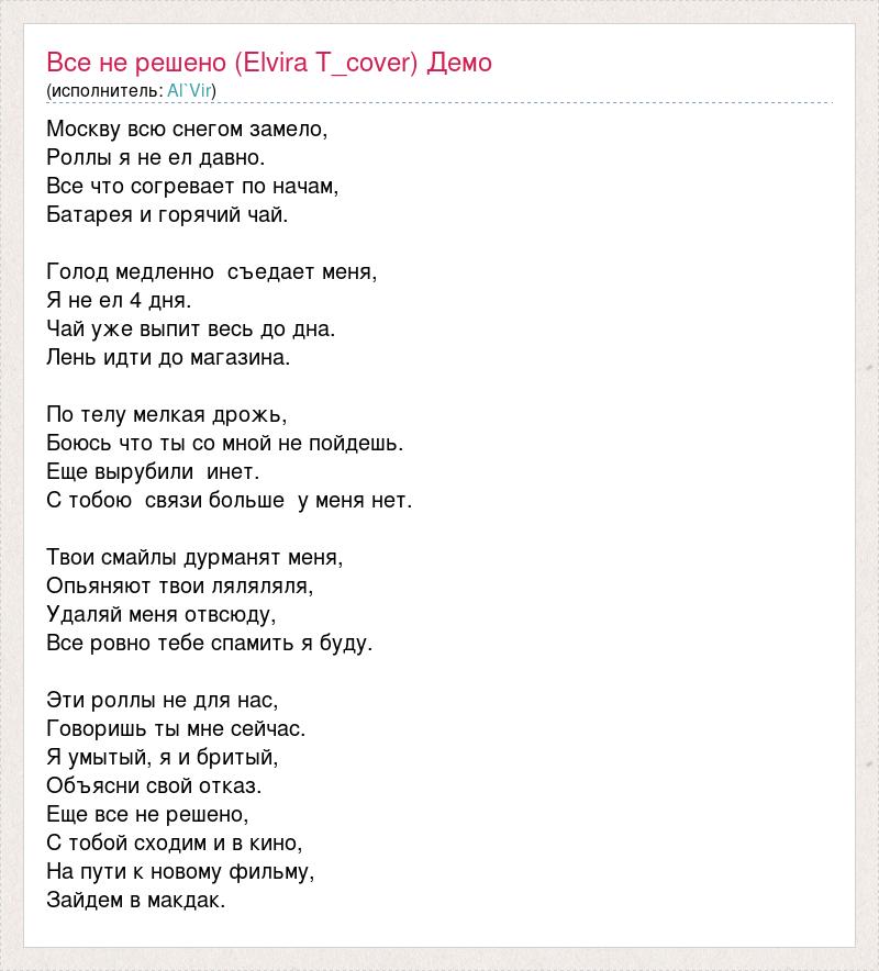 Москву всю снегом замело, Роллы я не ел давно. Все что согревает по начам, Батарея и горячий чай. Голод медленно съедает меня, Я не ел 4 дня. Чай уже выпит весь до дна. Лень идти до магазина. По телу мелкая дрожь, Боюсь что ты со мной не пойдешь. Еще вырубили инет. С тобою связи больше у меня нет. Твои смайлы дурманят меня, Опьяняют твои ляляляля, Удаляй меня отвсюду, Все ровно тебе спамить я буду. Эти роллы не для нас, Говоришь ты мне сейчас. Я умытый, я и бритый, Объясни свой отказ. Еще все не решено, С тобой сходим и в кино, На пути к новому фильму, Зайдем в макдак.