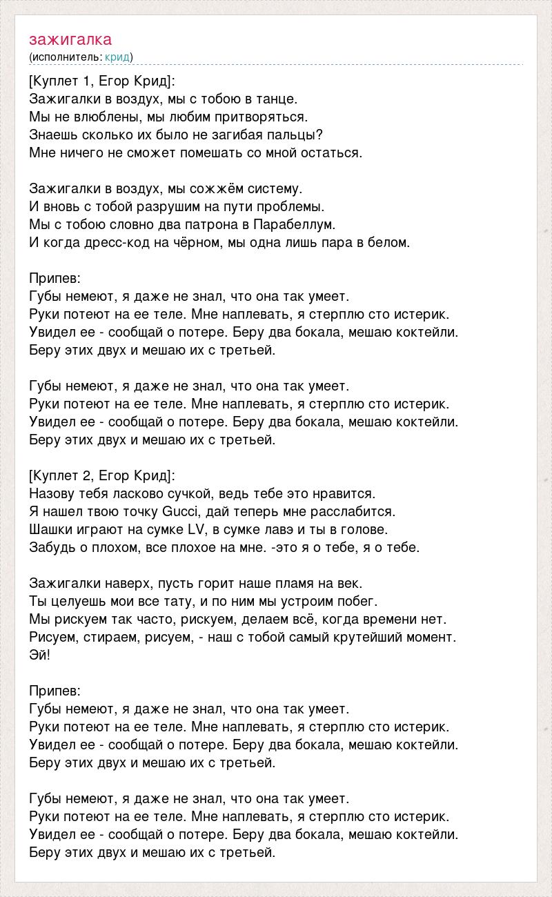 [Куплет 1, Егор Крид]: Зажигалки в воздух, мы с тобою в танце. Мы не влюблены, мы любим притворяться. Знаешь сколько их было не загибая пальцы? Мне ничего не сможет помешать со мной остаться. Зажигалки в воздух, мы сожжём систему. И вновь с тобой разрушим на пути проблемы. Мы с тобою словно два патрона в Парабеллум. И когда дресс-код на чёрном, мы одна лишь пара в белом. Припев: Губы немеют, я даже не знал, что она так умеет. Руки потеют на ее теле. Мне наплевать, я стерплю сто истерик. Увидел ее - сообщай о потере. Беру два бокала, мешаю коктейли. Беру этих двух и мешаю их с третьей. Губы немеют, я даже не знал, что она так умеет. Руки потеют на ее теле. Мне наплевать, я стерплю сто истерик. Увидел ее - сообщай о потере. Беру два бокала, мешаю коктейли. Беру этих двух и мешаю их с третьей. [Куплет 2, Егор Крид]: Назову тебя ласково сучкой, ведь тебе это нравится. Я нашел твою точку Gucci, дай теперь мне расслабится. Шашки играют на сумке LV, в сумке лавэ и ты в голове. Забудь о плохом, все плохое на мне. -это я о тебе, я о тебе. Зажигалки наверх, пусть горит наше пламя на век. Ты целуешь мои все тату, и по ним мы устроим побег. Мы рискуем так часто, рискуем, делаем всё, когда времени нет. Рисуем, стираем, рисуем, - наш с тобой самый крутейший момент. Эй! Припев: Губы немеют, я даже не знал, что она так умеет. Руки потеют на ее теле. Мне наплевать, я стерплю сто истерик. Увидел ее - сообщай о потере. Беру два бокала, мешаю коктейли. Беру этих двух и мешаю их с третьей. Губы немеют, я даже не знал, что она так умеет. Руки потеют на ее теле. Мне наплевать, я стерплю сто истерик. Увидел ее - сообщай о потере. Беру два бокала, мешаю коктейли. Беру этих двух и мешаю их с третьей.